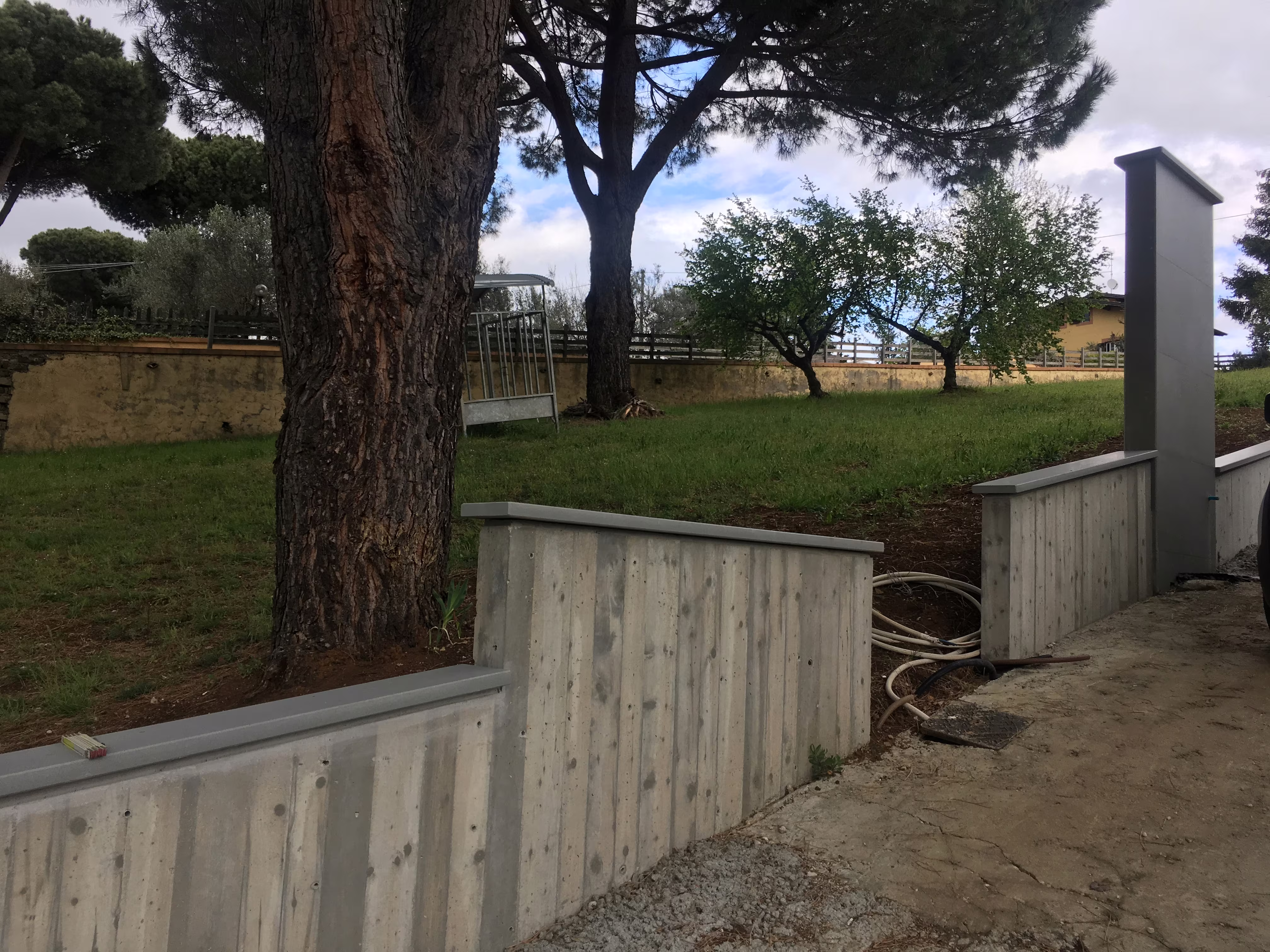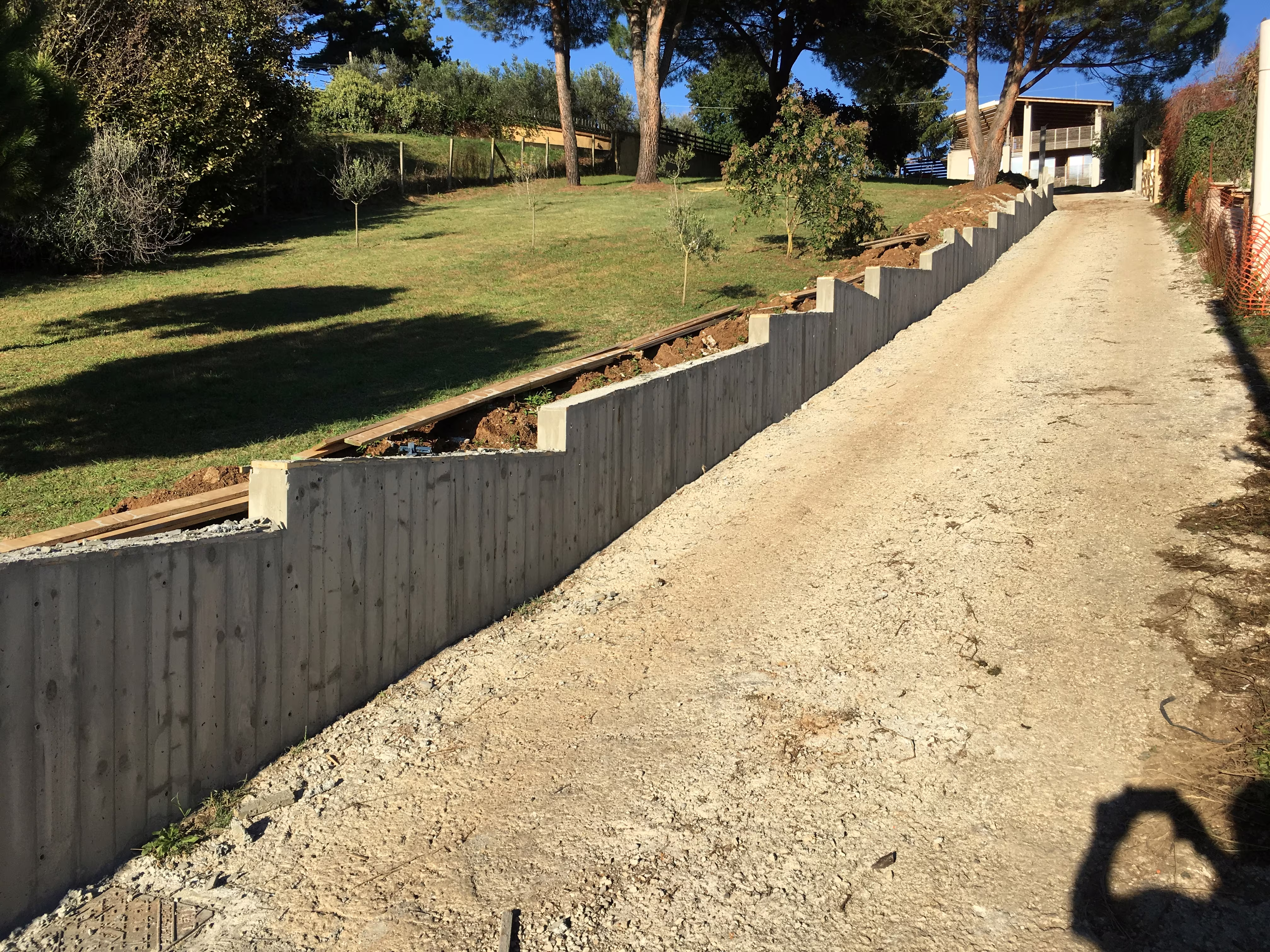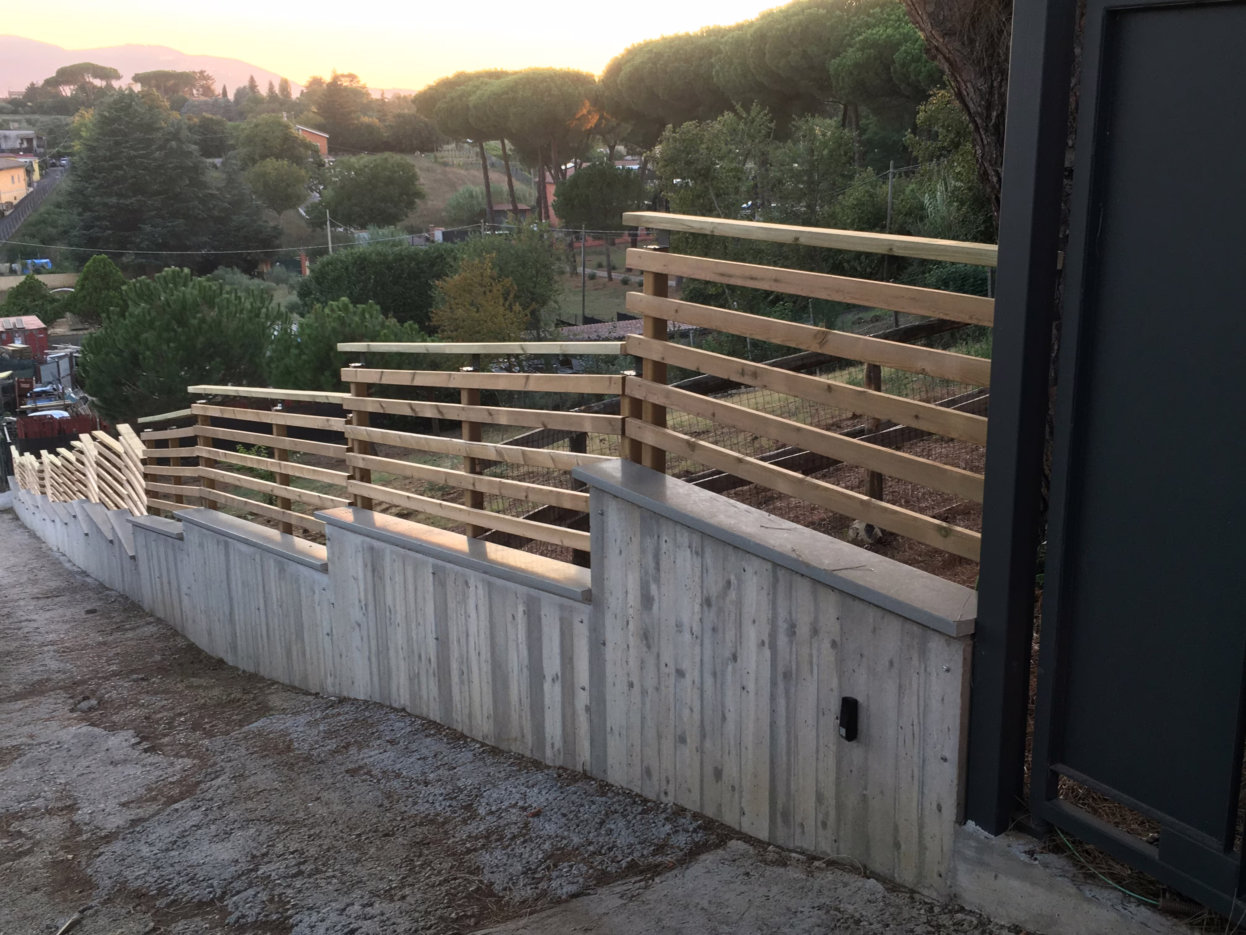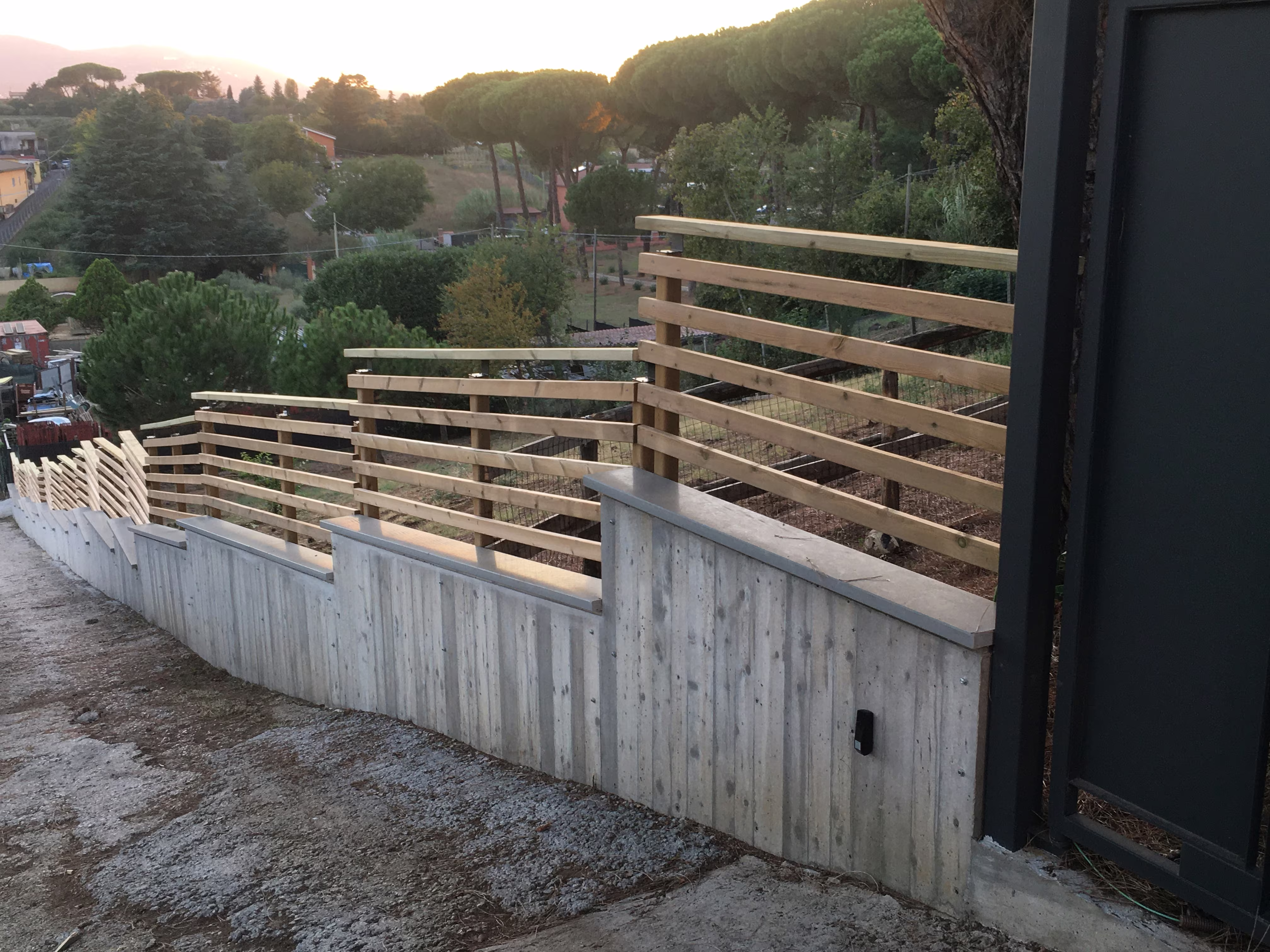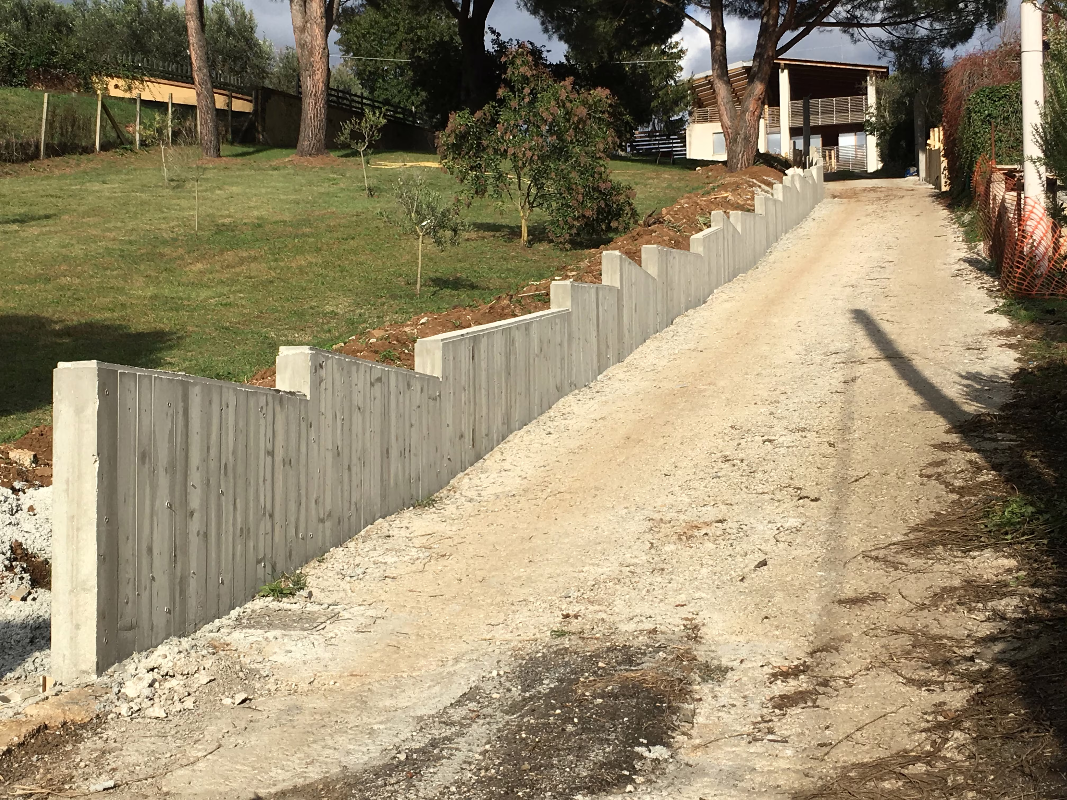 L’intervento ha riguardato la realizzazione di una recinzione complessa lungo un percorso in forte pendenza, caratterizzata da muretti in cemento armato a faccia vista, eseguiti mediante casserature verticali in tavole di legno tutte di misure differenti.