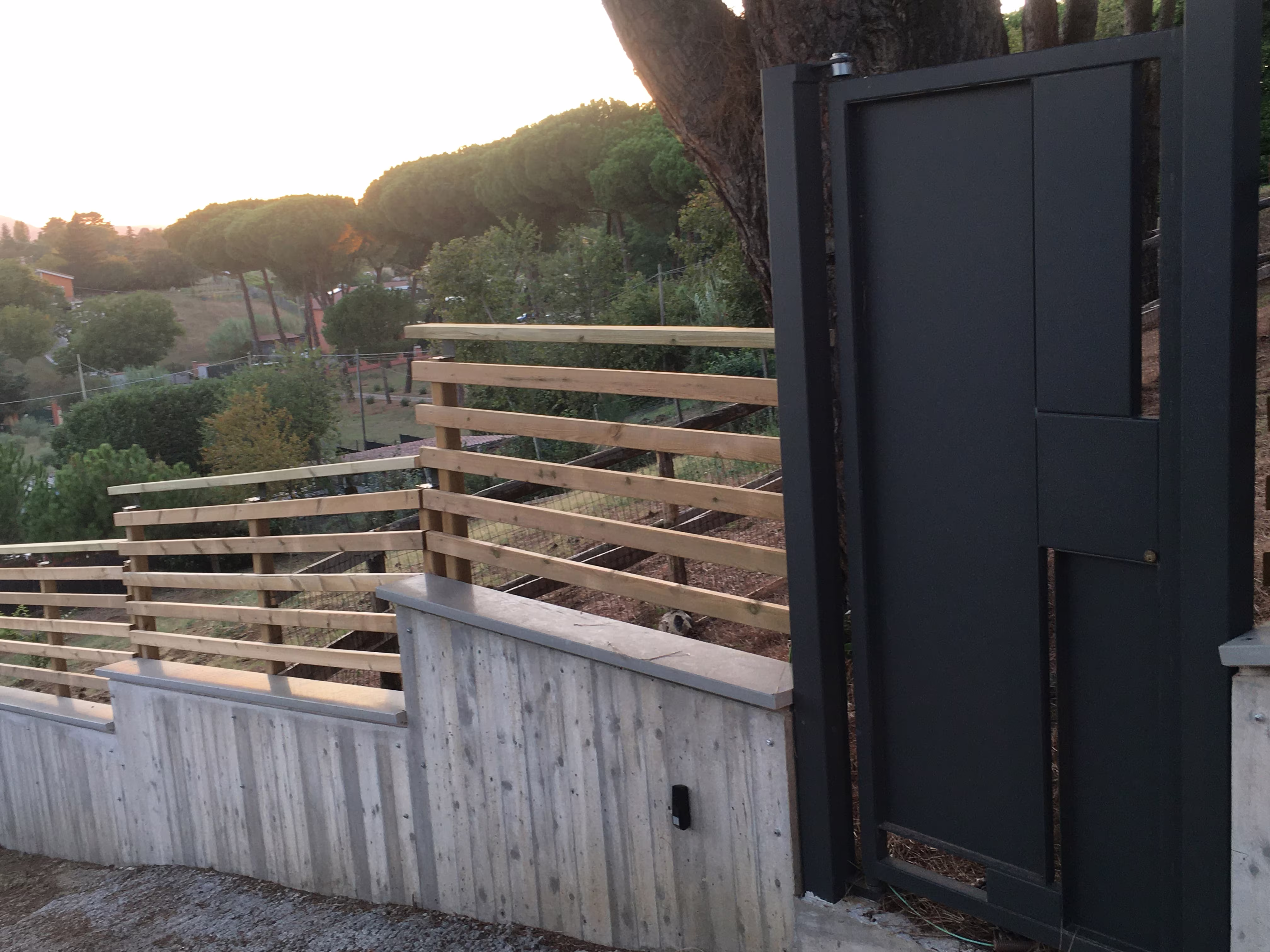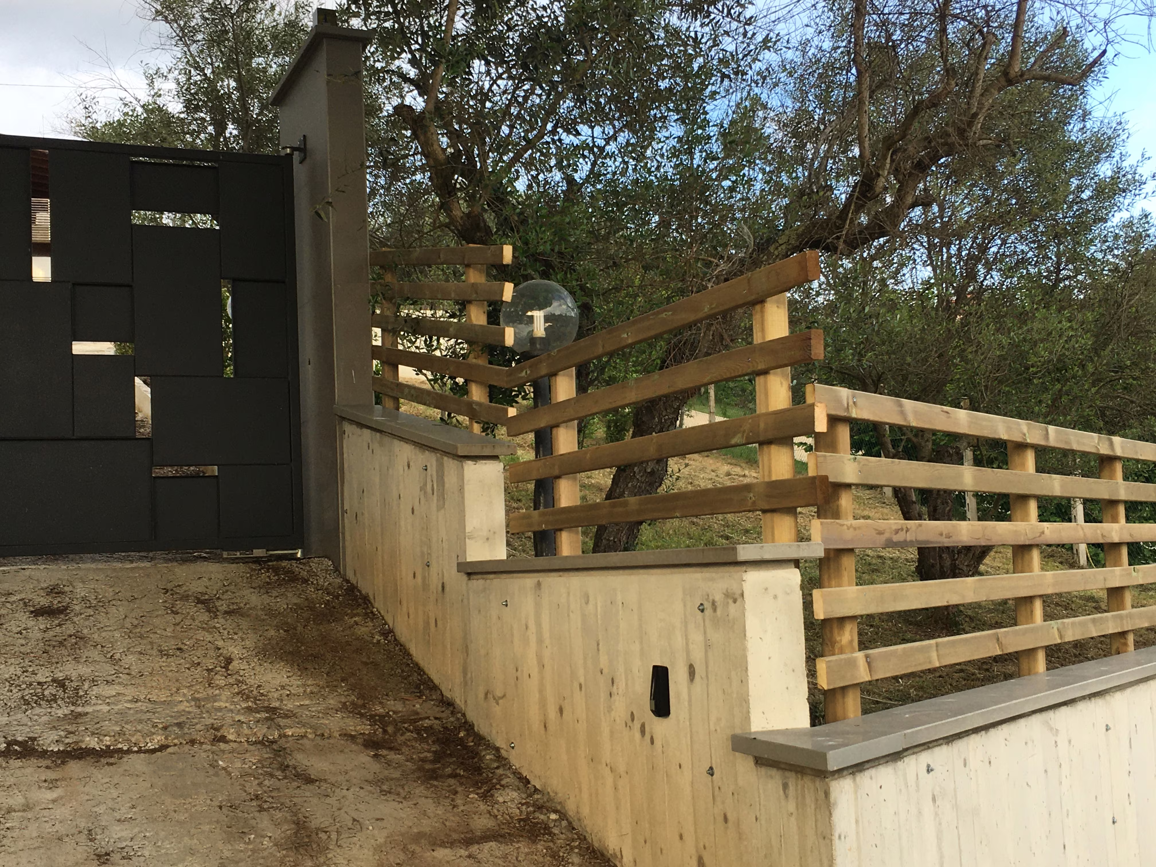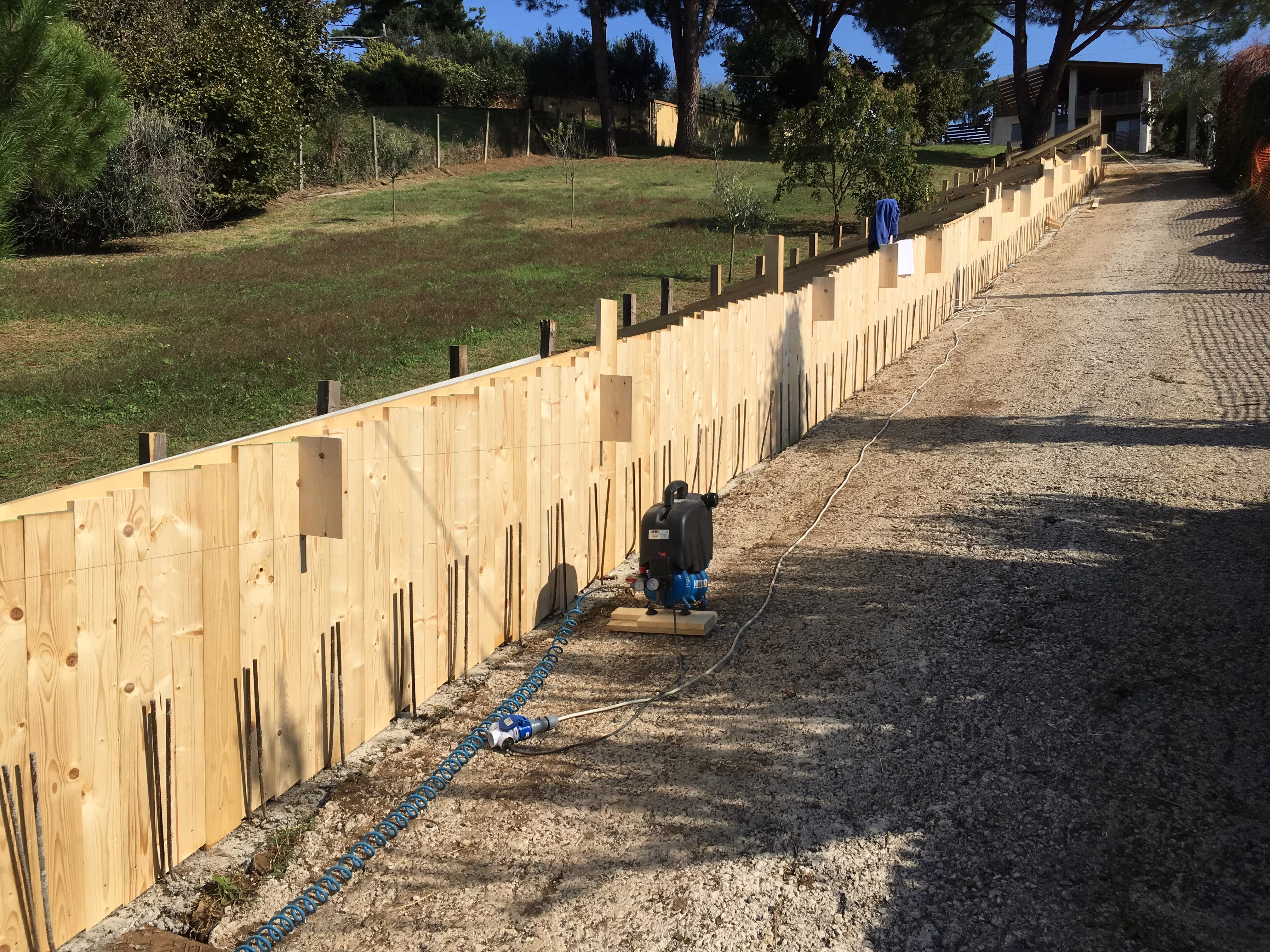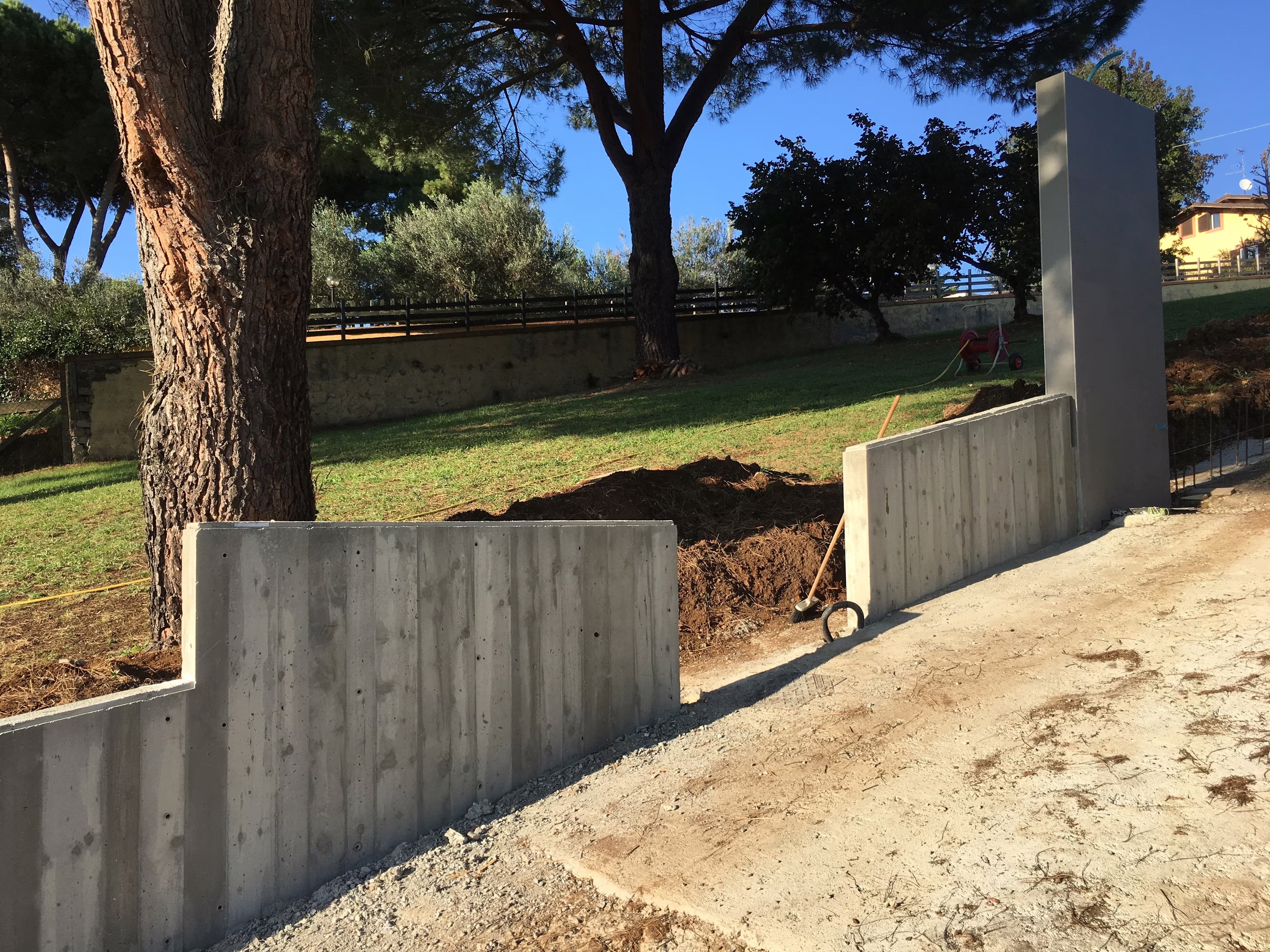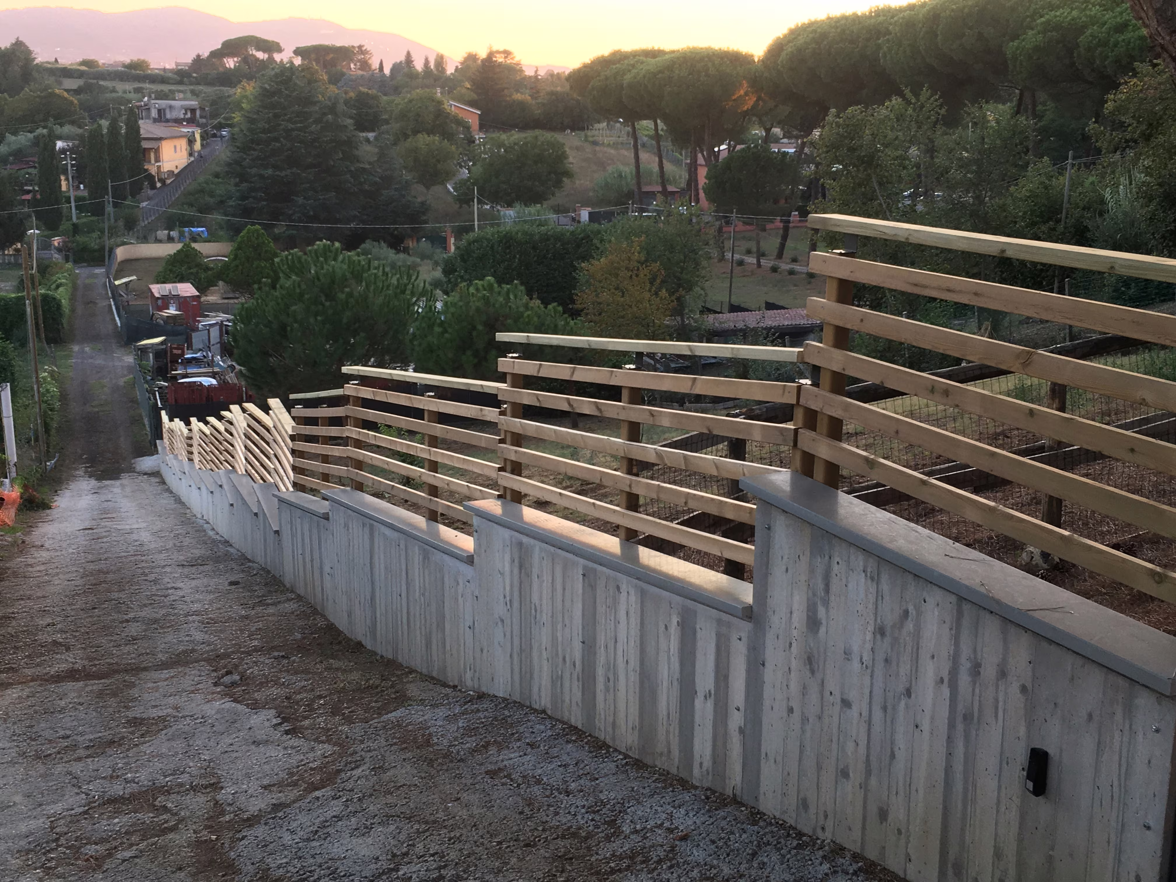 L’intervento ha riguardato la realizzazione di una recinzione complessa lungo un percorso in forte pendenza, caratterizzata da muretti in cemento armato a faccia vista, eseguiti mediante casserature verticali in tavole di legno tutte di misure differenti.