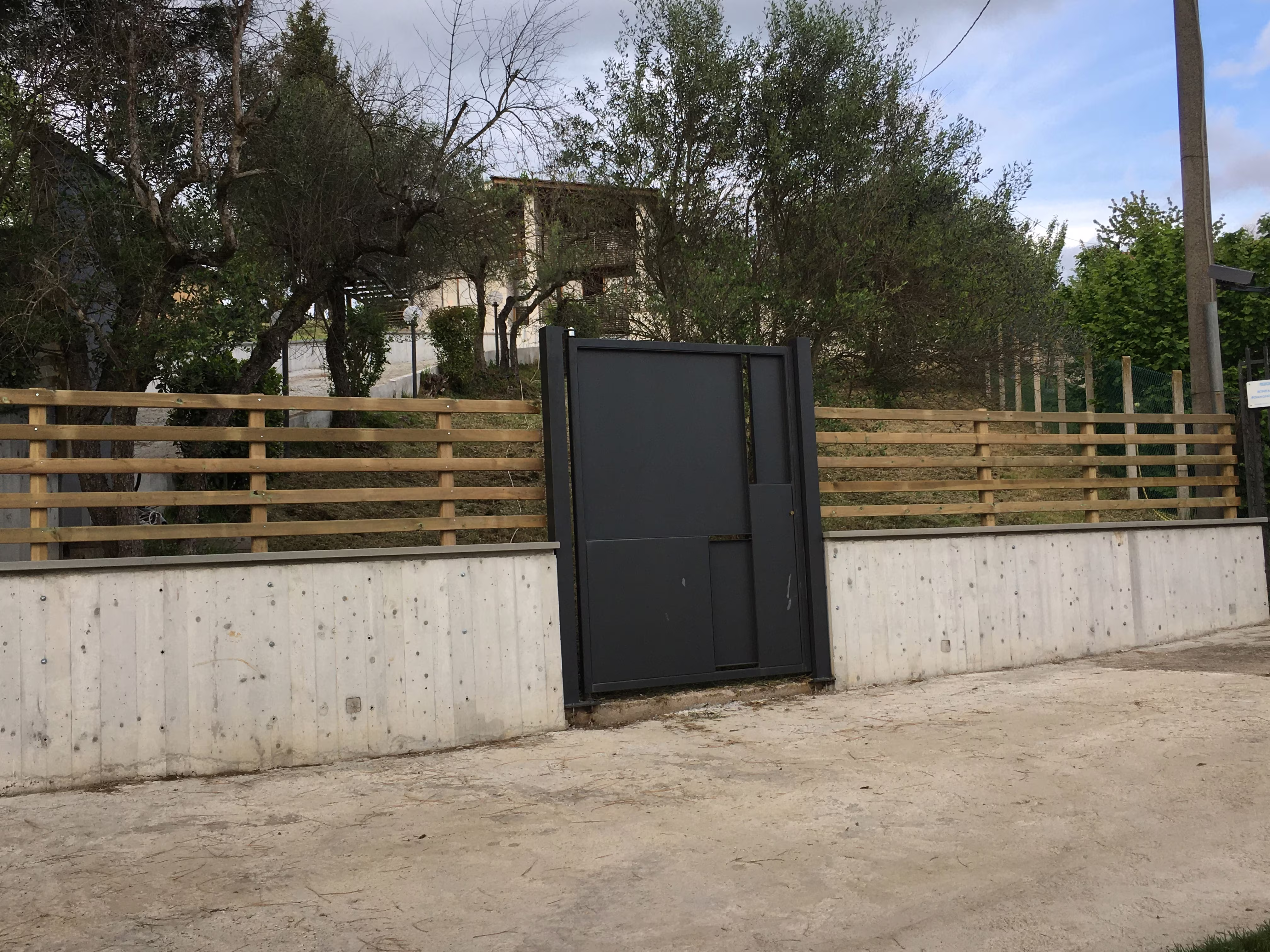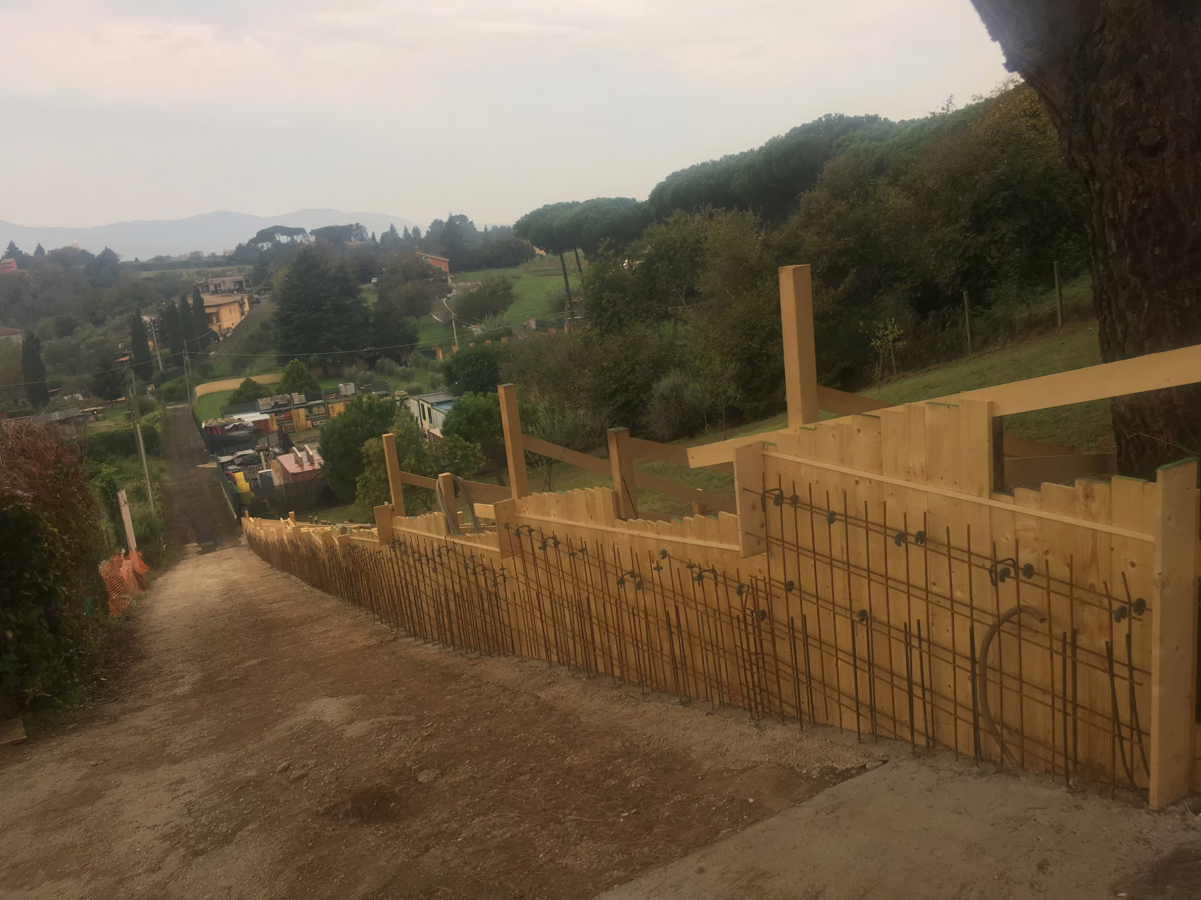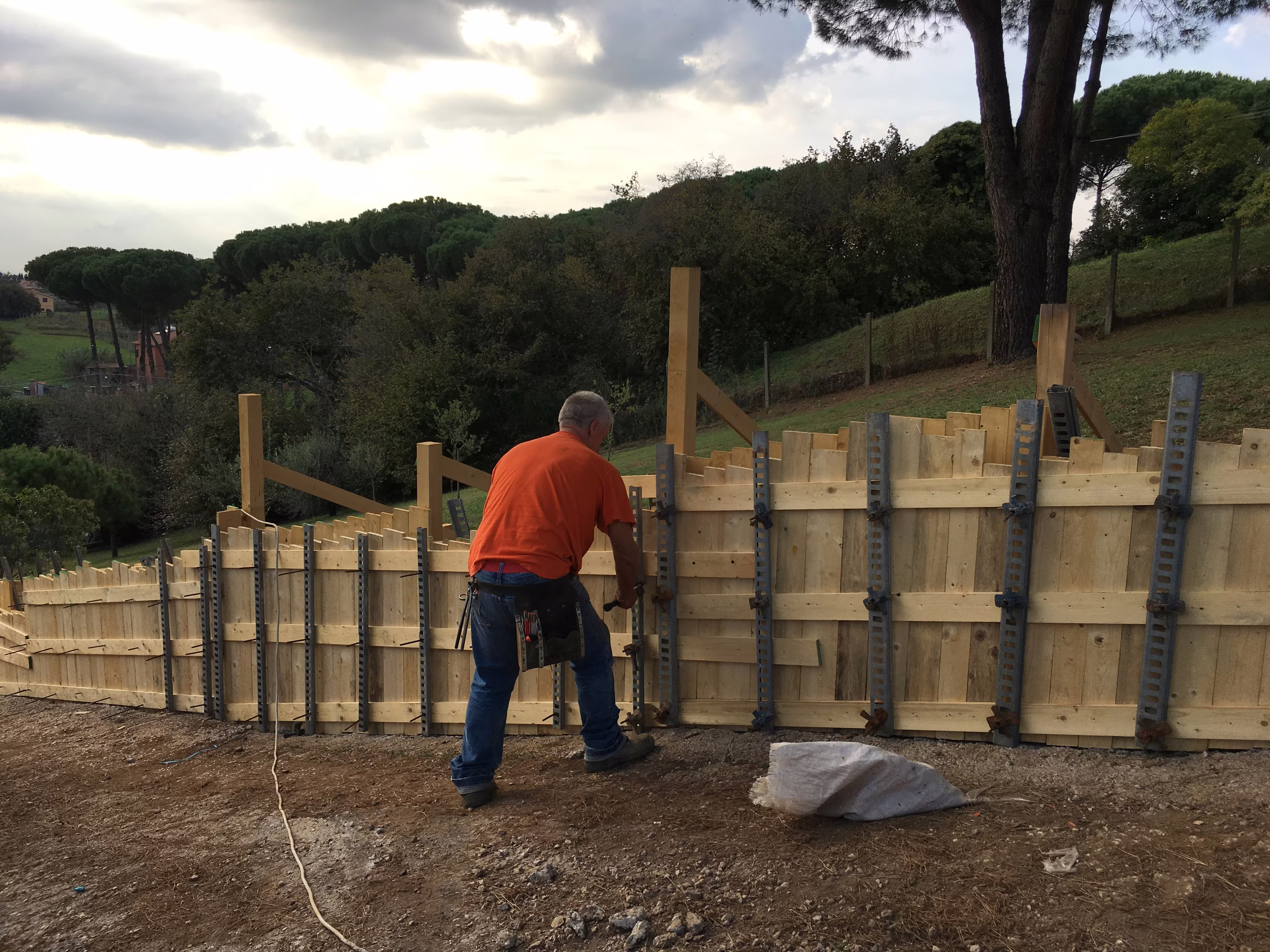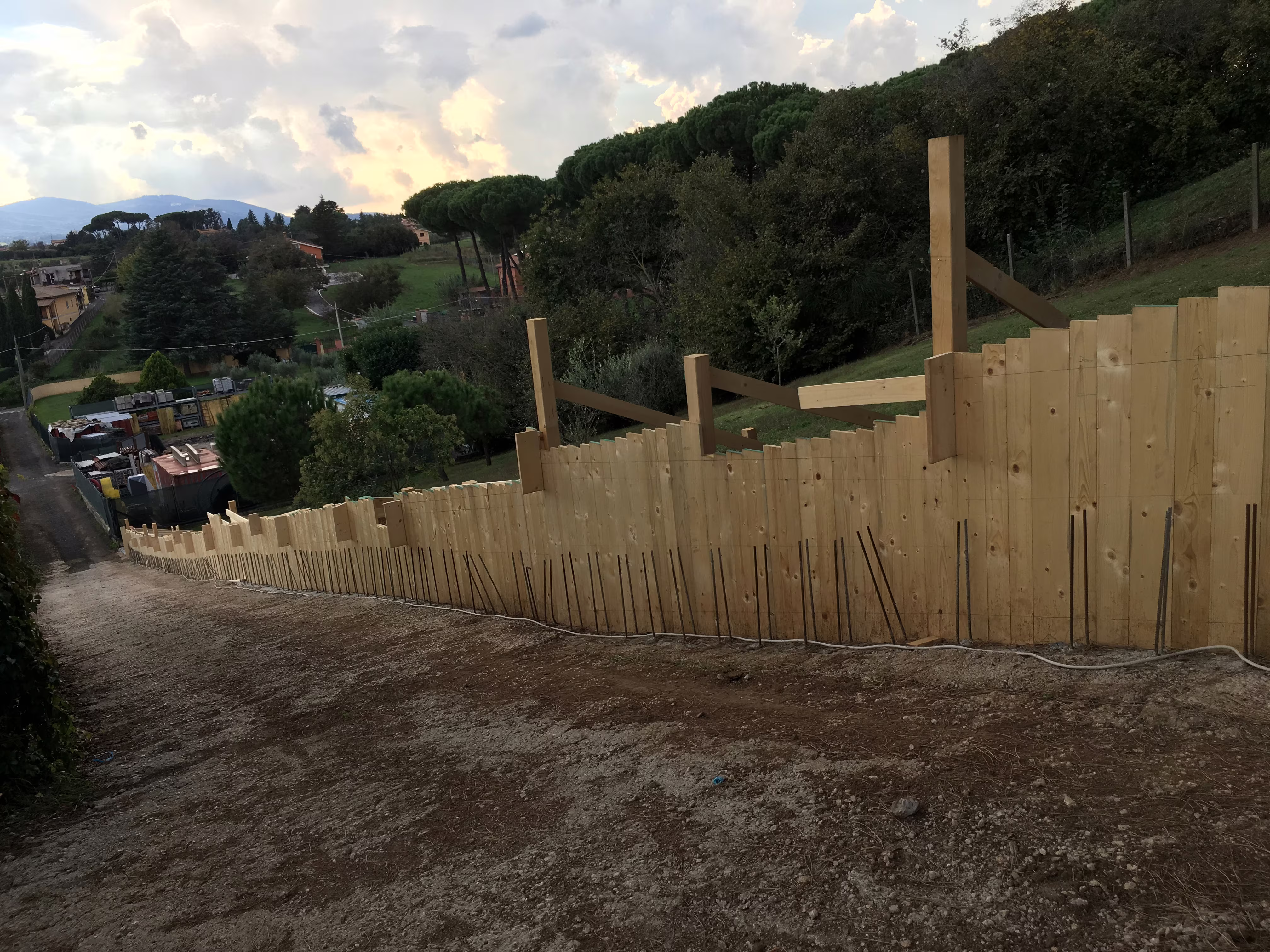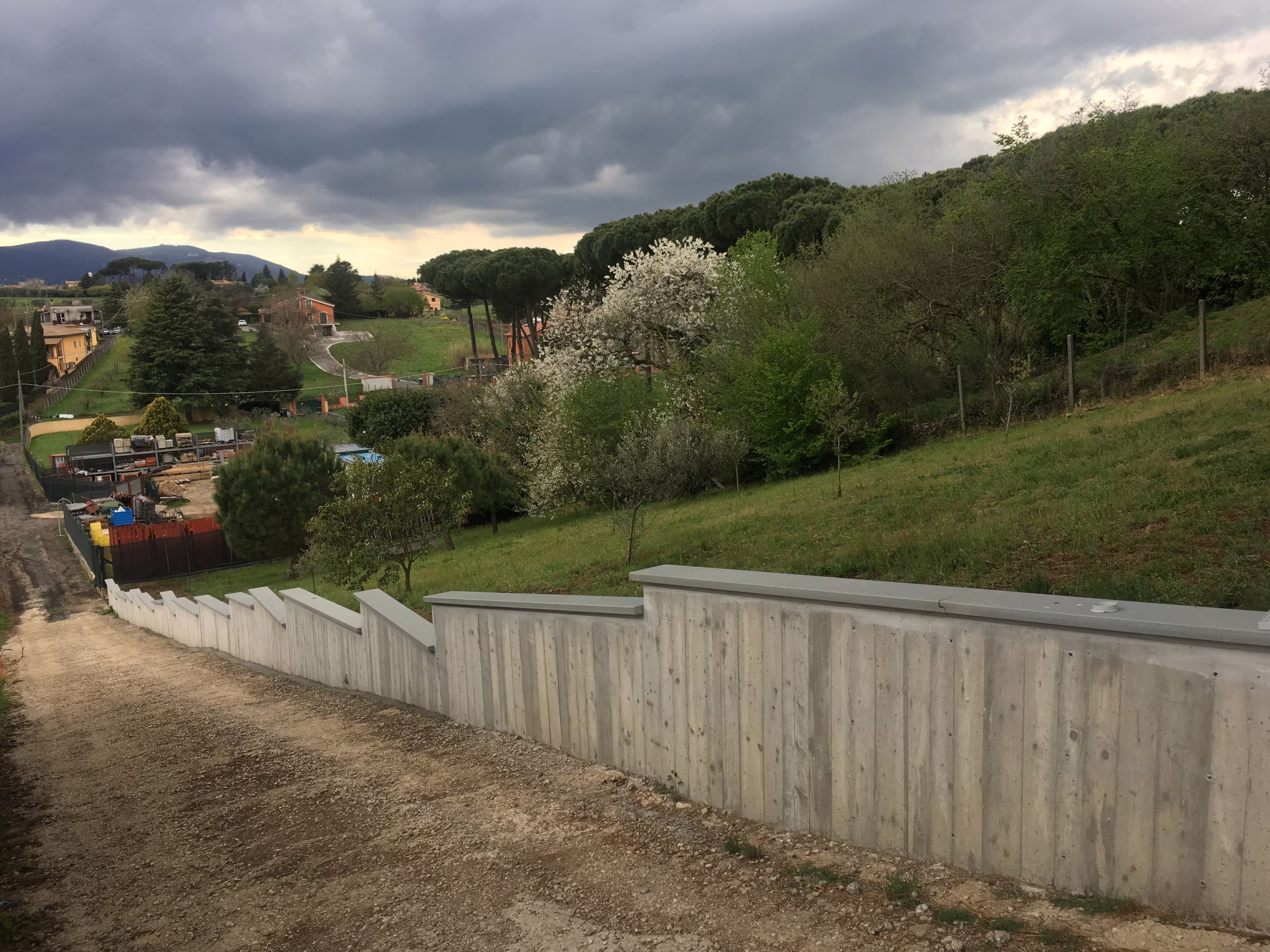 L’intervento ha riguardato la realizzazione di una recinzione complessa lungo un percorso in forte pendenza, caratterizzata da muretti in cemento armato a faccia vista, eseguiti mediante casserature verticali in tavole di legno tutte di misure differenti.