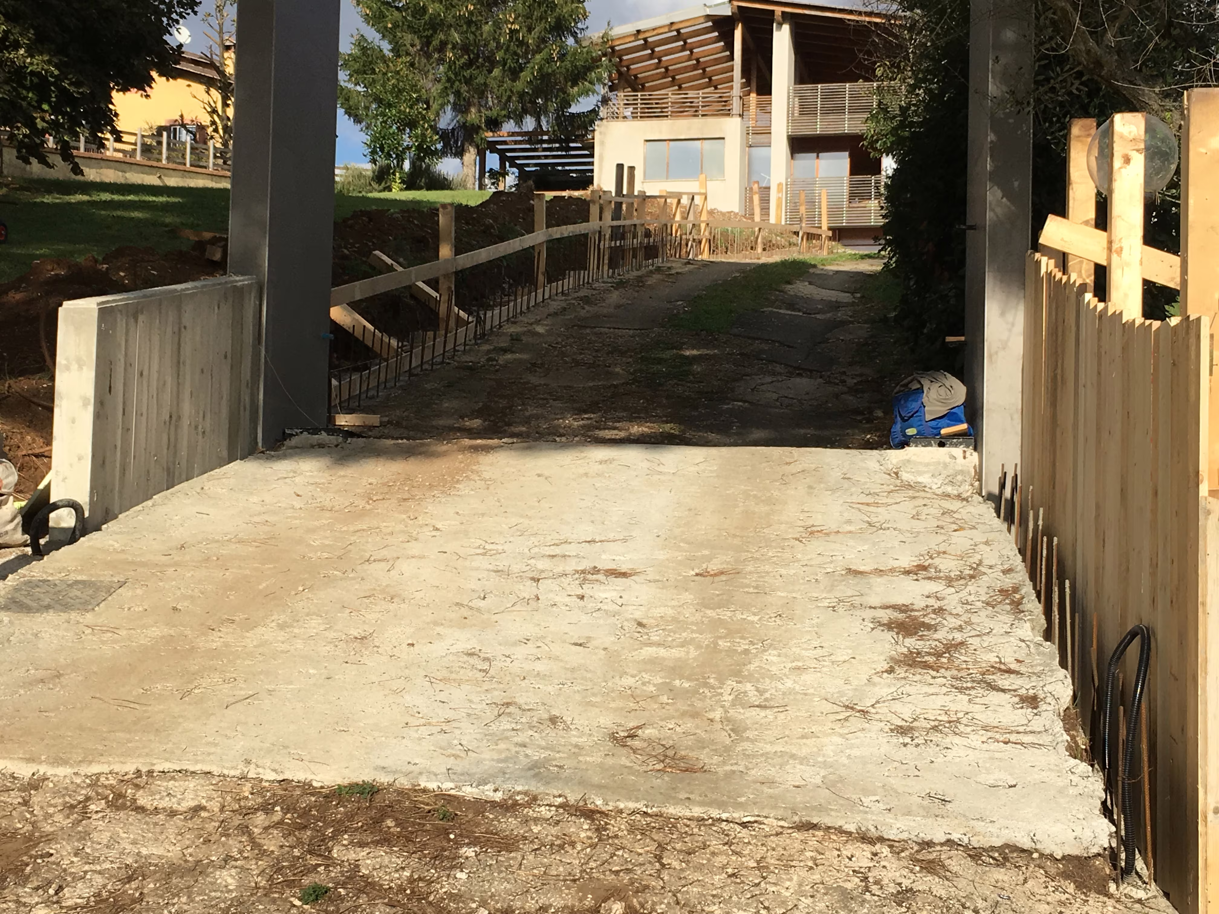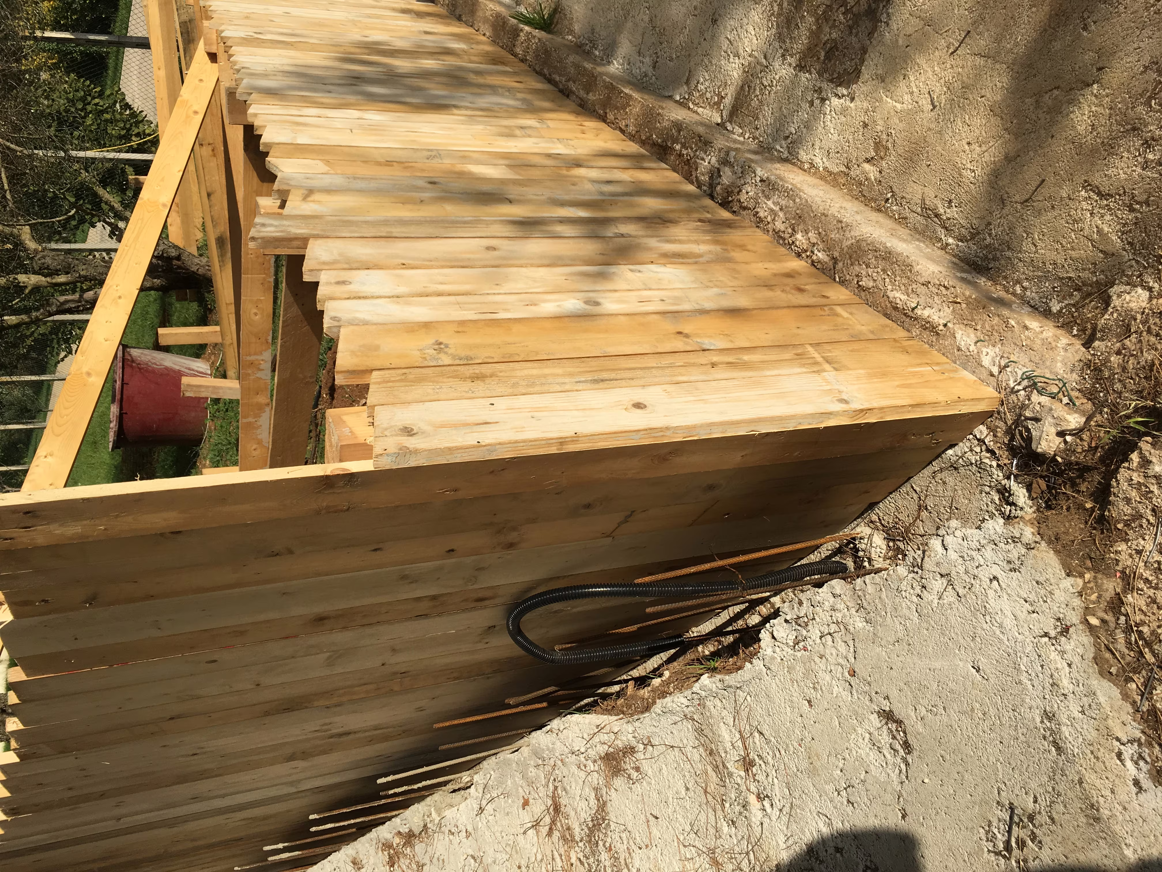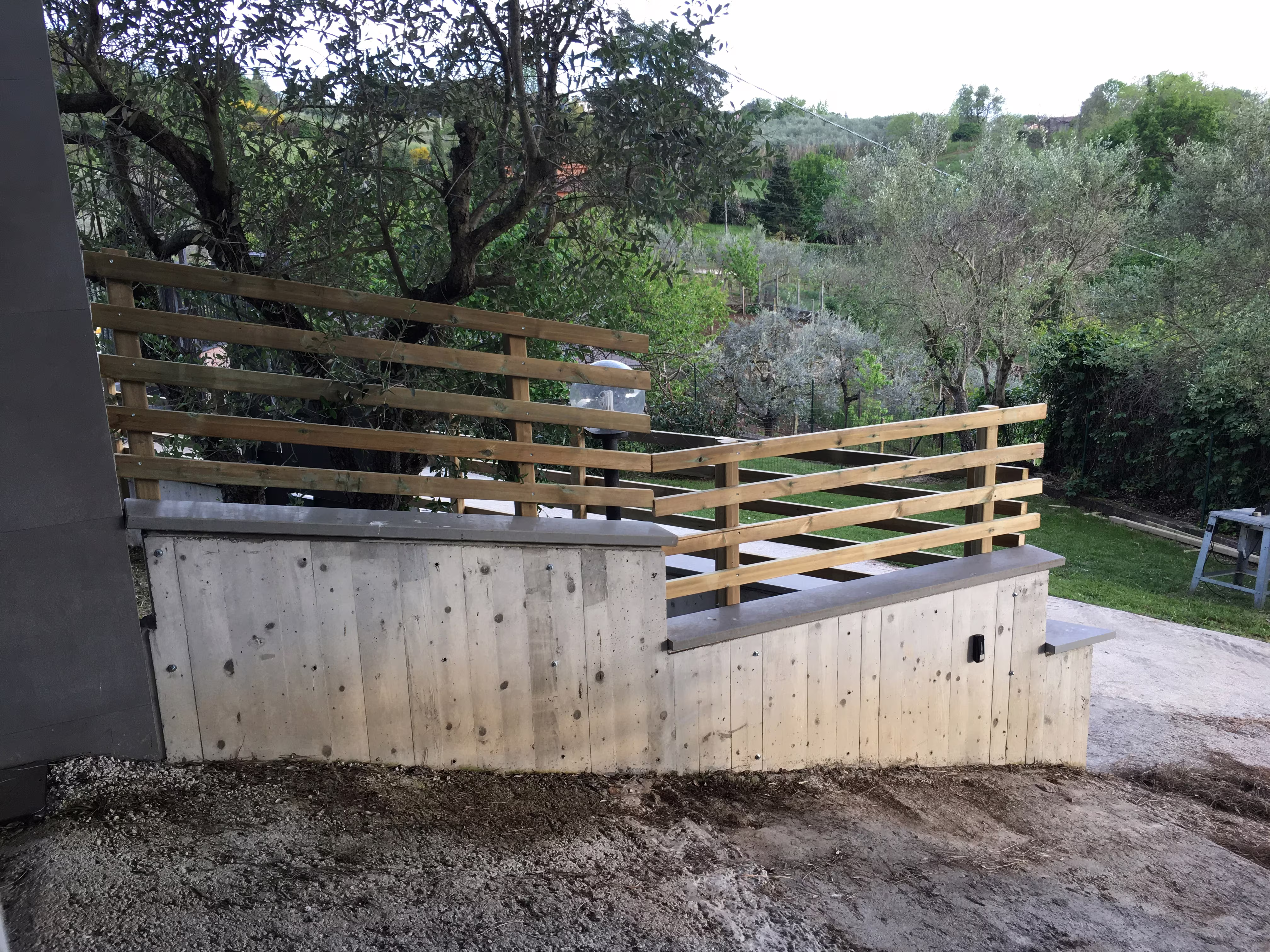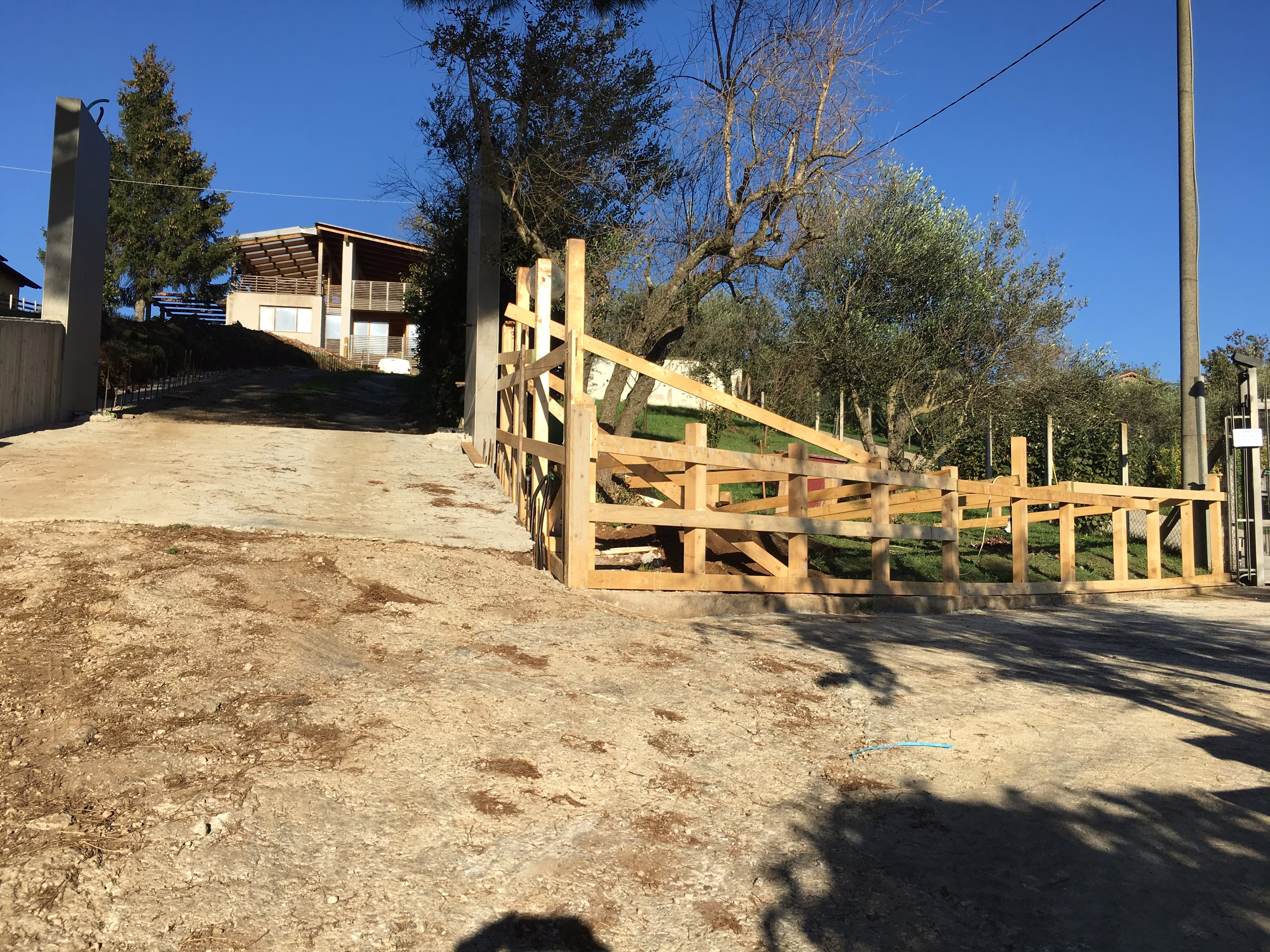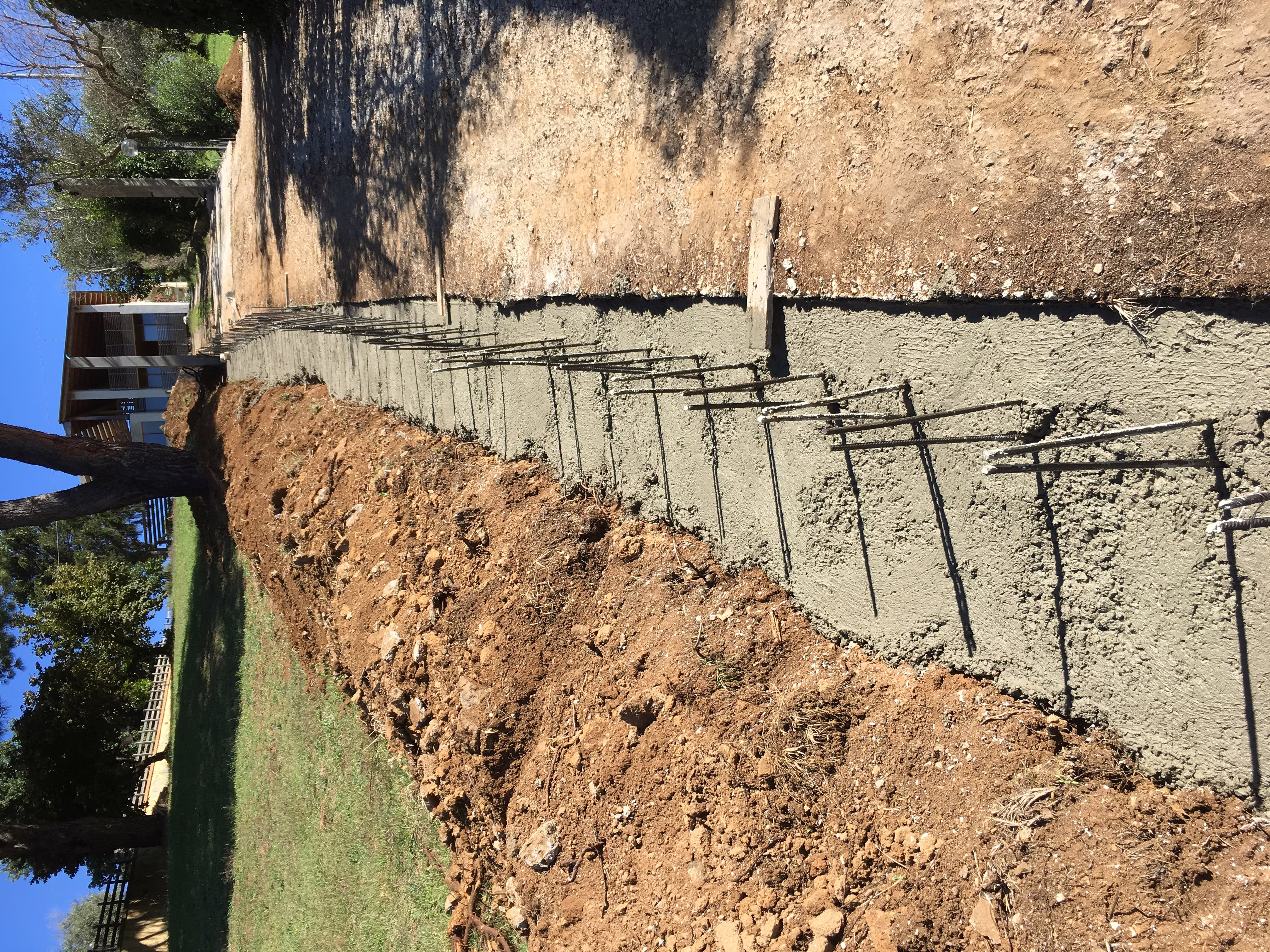 L’intervento ha riguardato la realizzazione di una recinzione complessa lungo un percorso in forte pendenza, caratterizzata da muretti in cemento armato a faccia vista, eseguiti mediante casserature verticali in tavole di legno tutte di misure differenti.