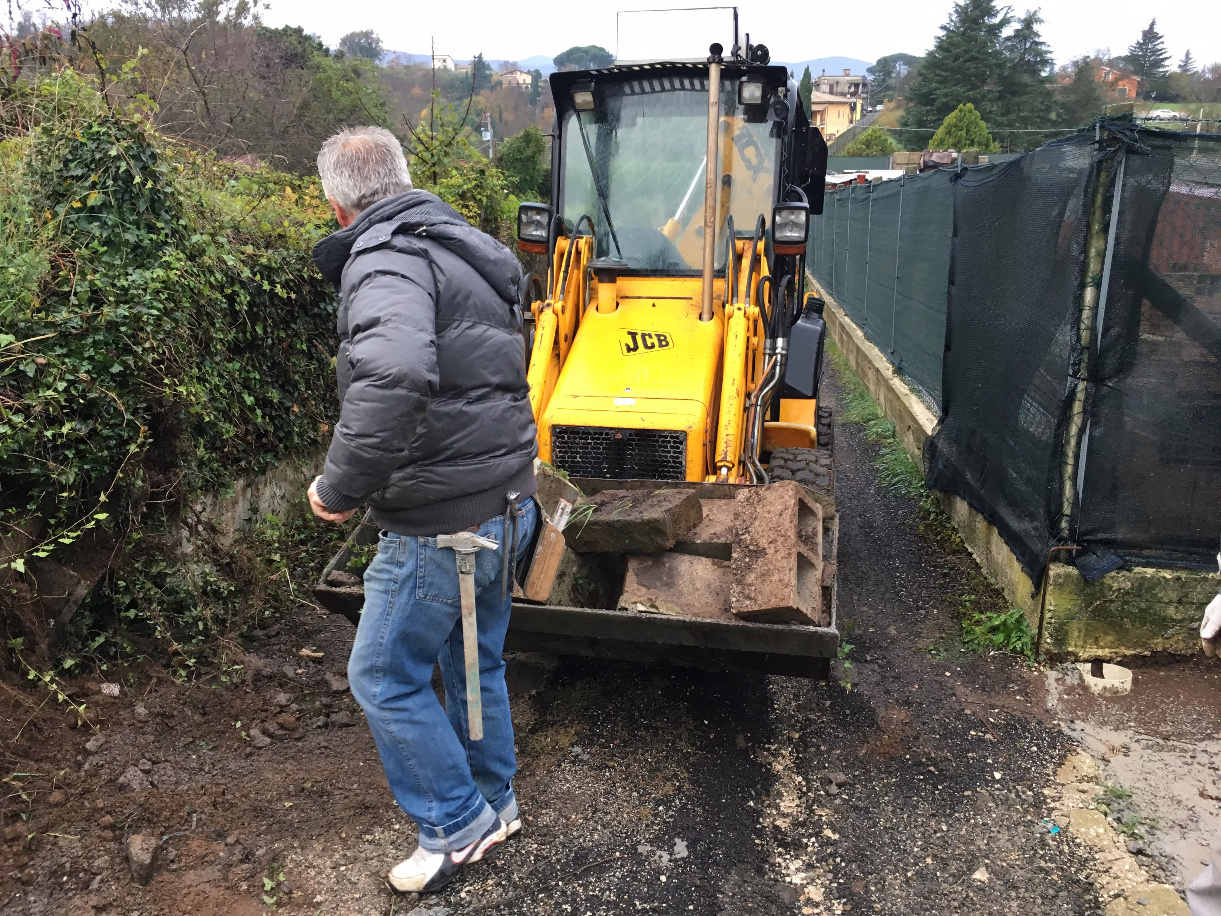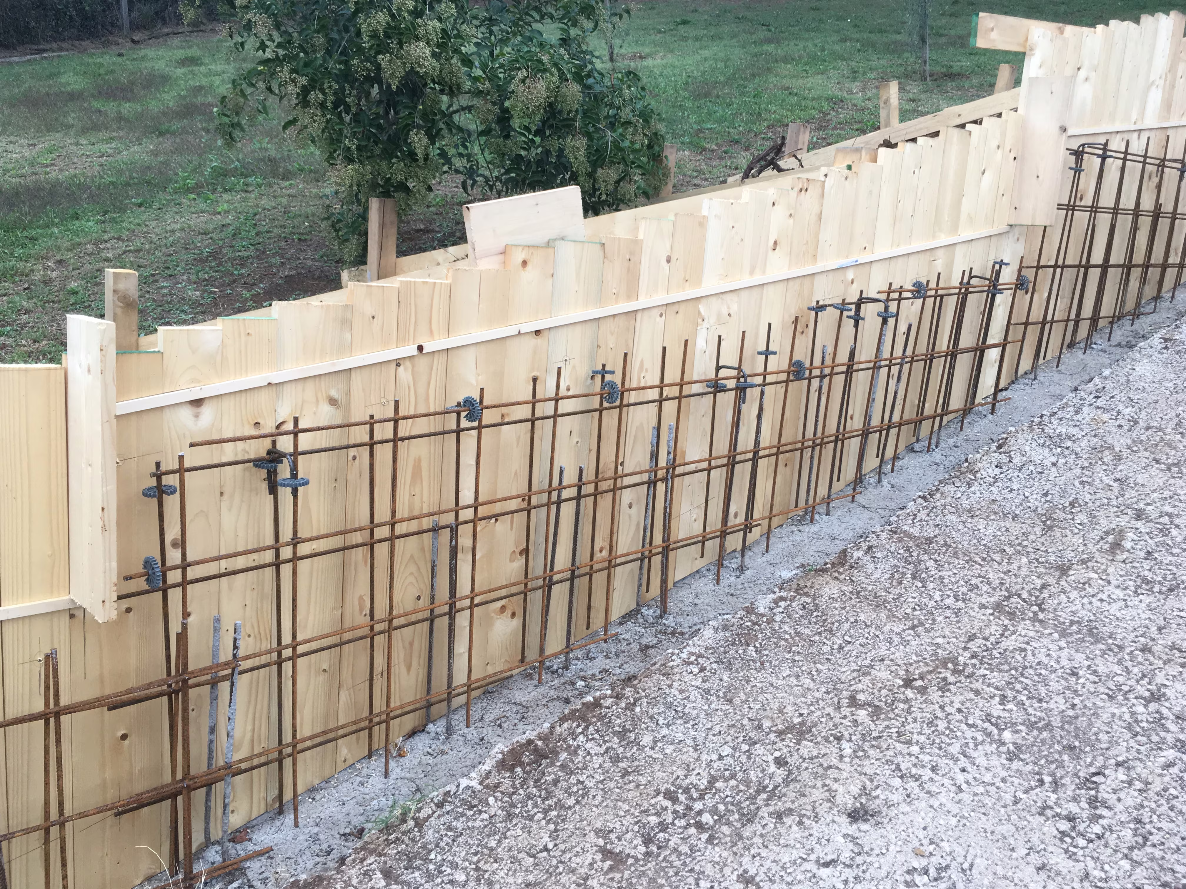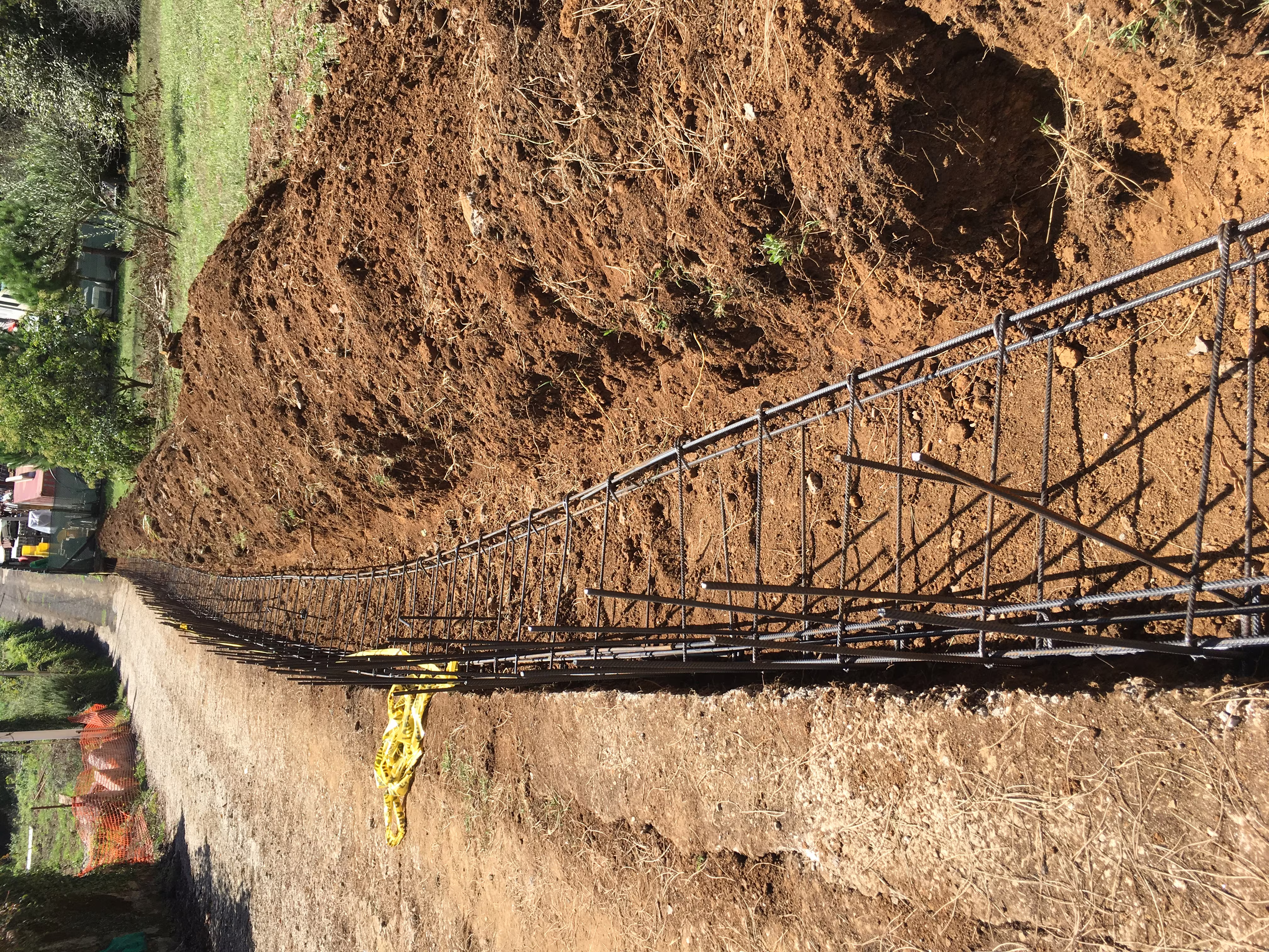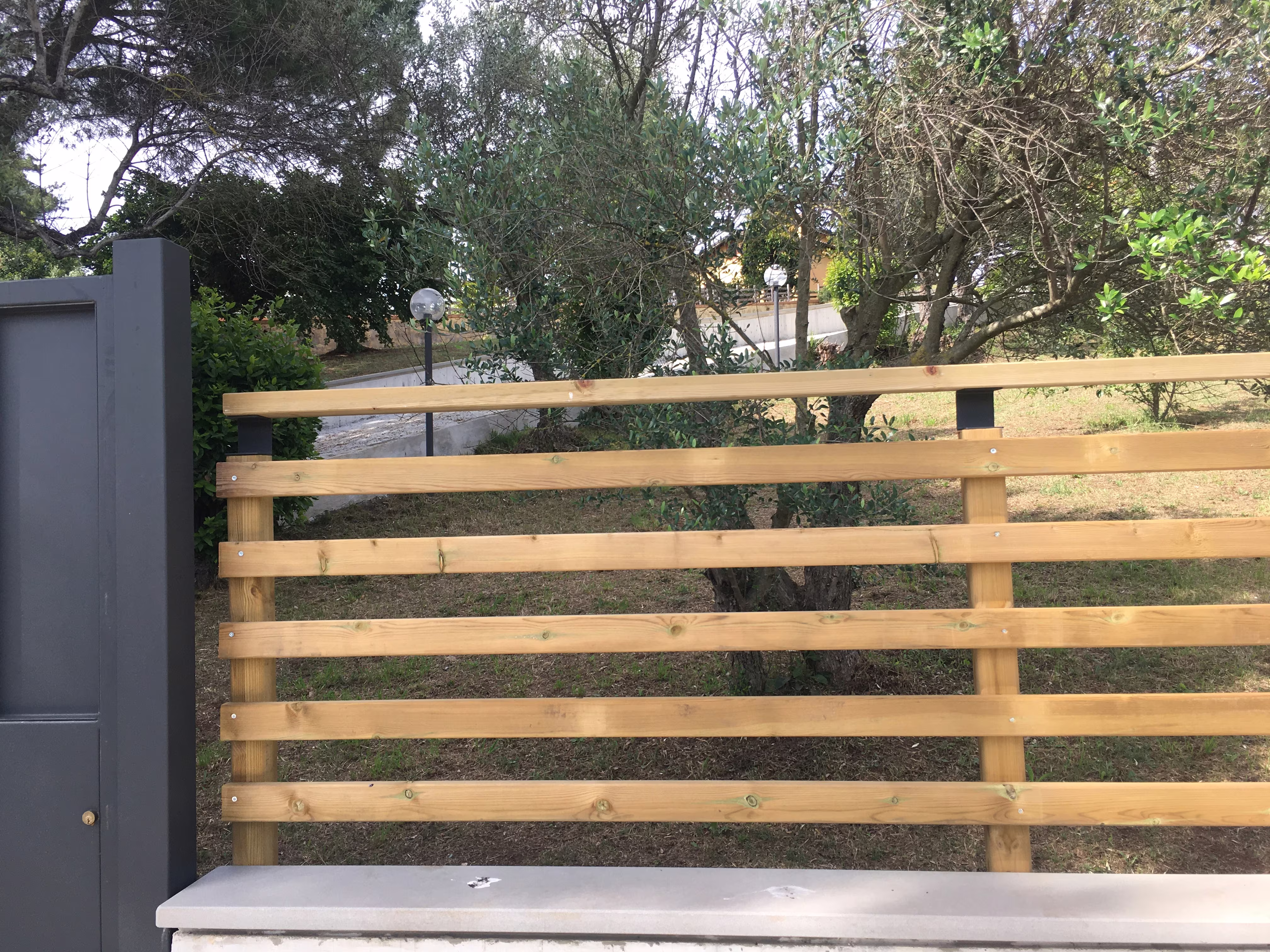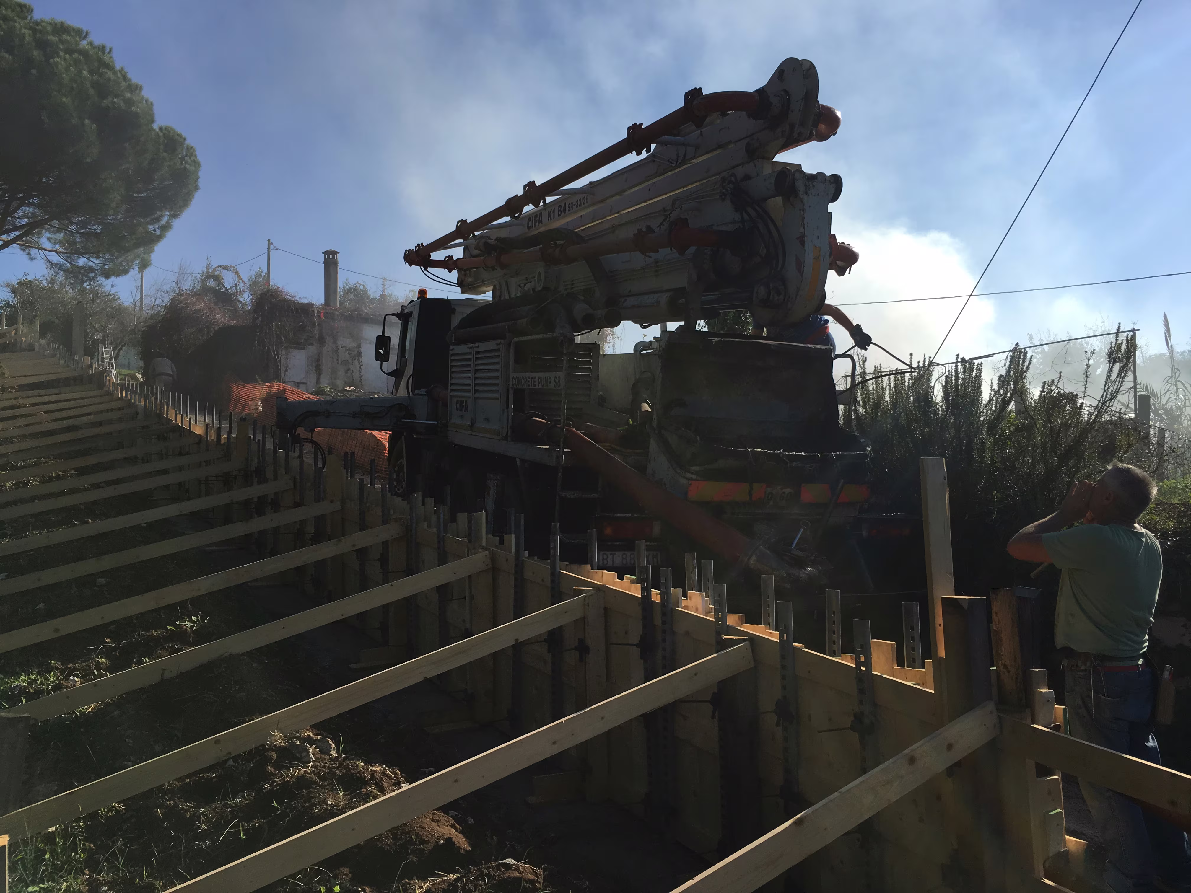 L’intervento ha riguardato la realizzazione di una recinzione complessa lungo un percorso in forte pendenza, caratterizzata da muretti in cemento armato a faccia vista, eseguiti mediante casserature verticali in tavole di legno tutte di misure differenti.