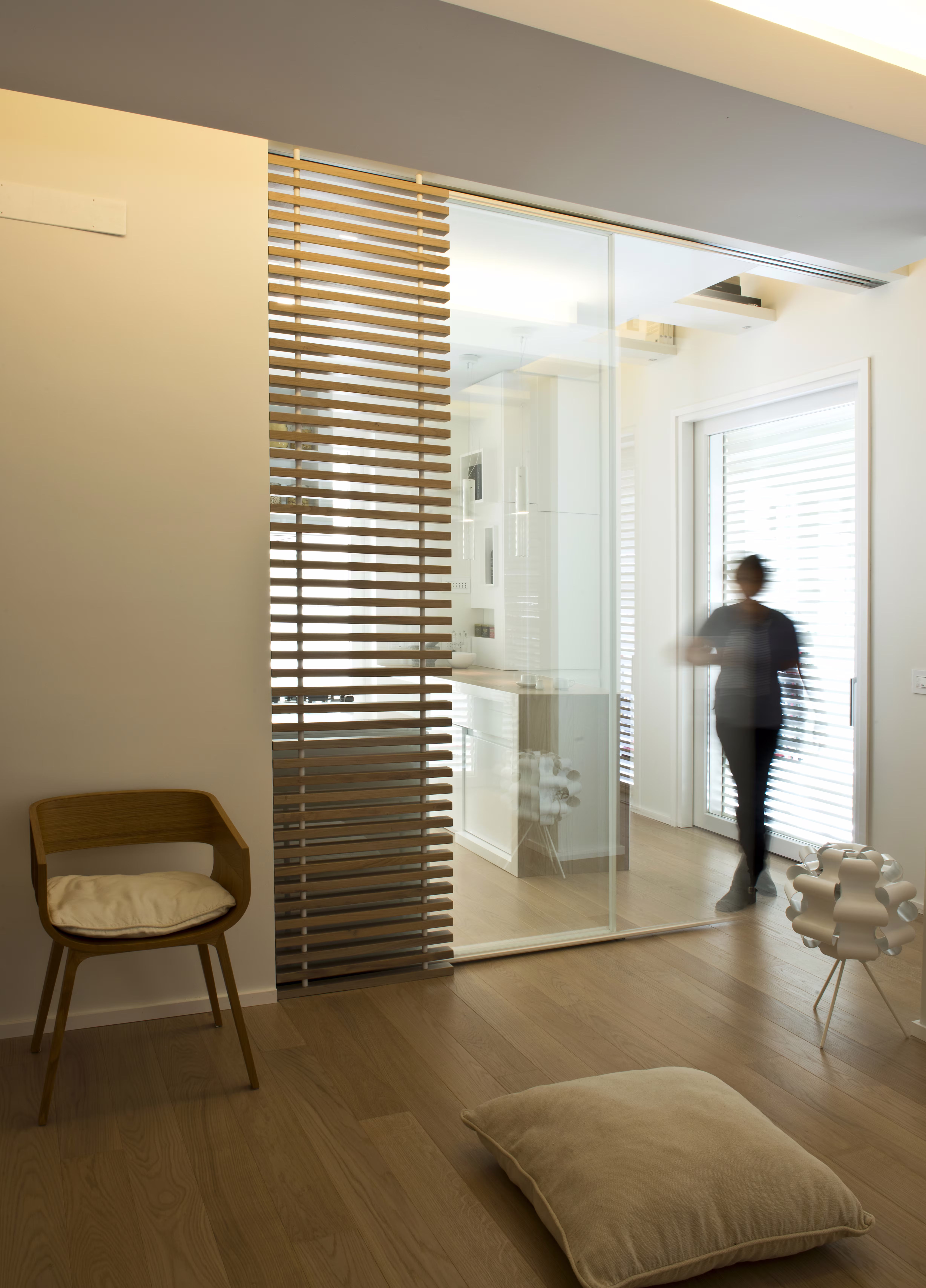 Tra le soluzioni più originali, il parquet in rovere è stato utilizzato anche come rivestimento del bagno privato della camera del figlio dei proprietari, creando un effetto caldo e avvolgente. La centralina dell’impianto radiante RDZ è stata occultata in un mobile in legno su misura, progettato per unire estetica e funzionalità.