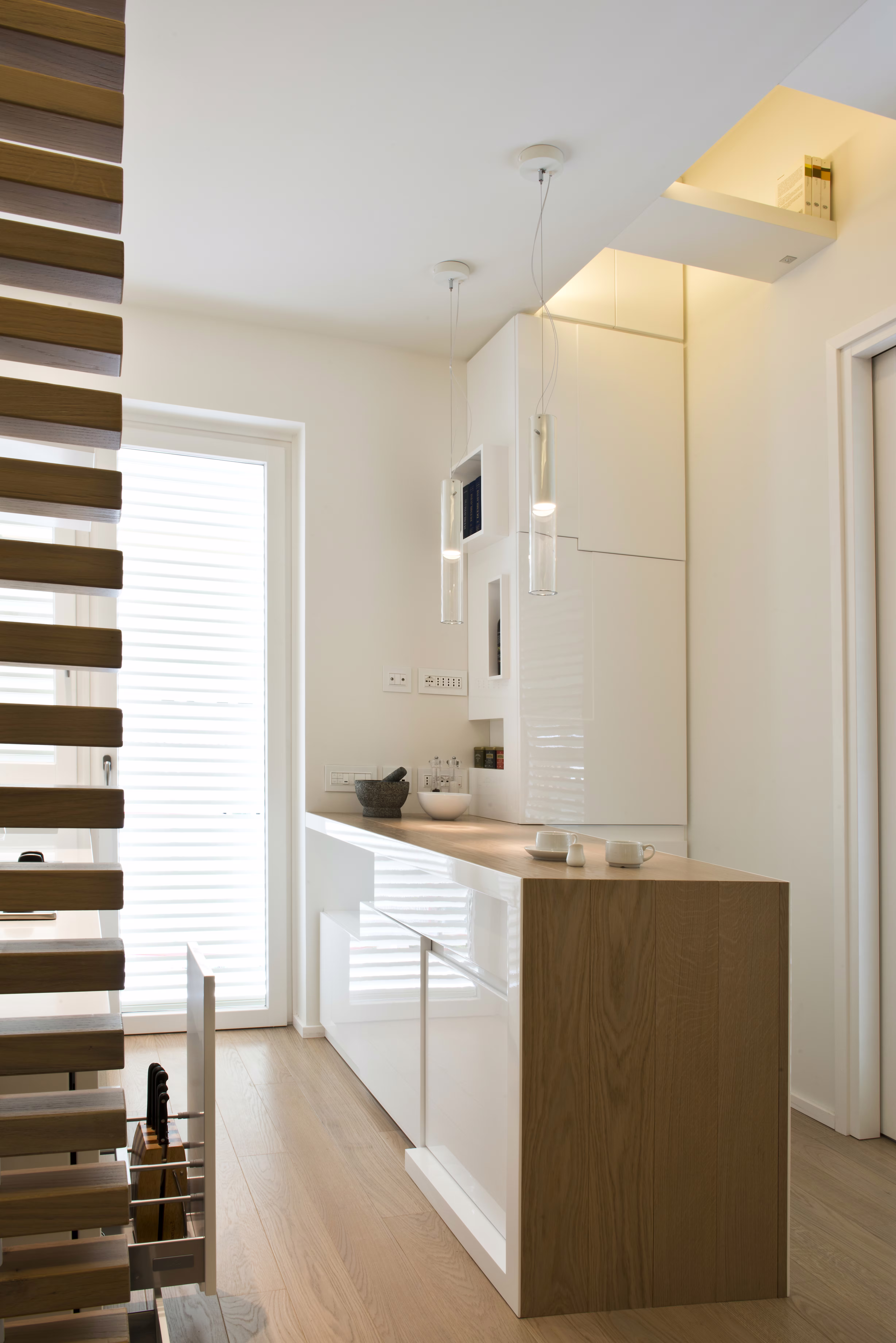 Per rispondere alla grande passione dei proprietari per la lettura, il corridoio è stato trasformato in un’area libreria, con nicchie e mensole porta-libri realizzate su misura, sfruttando anche lo spazio recuperato dalla demolizione di un vecchio controsoffitto in canne.