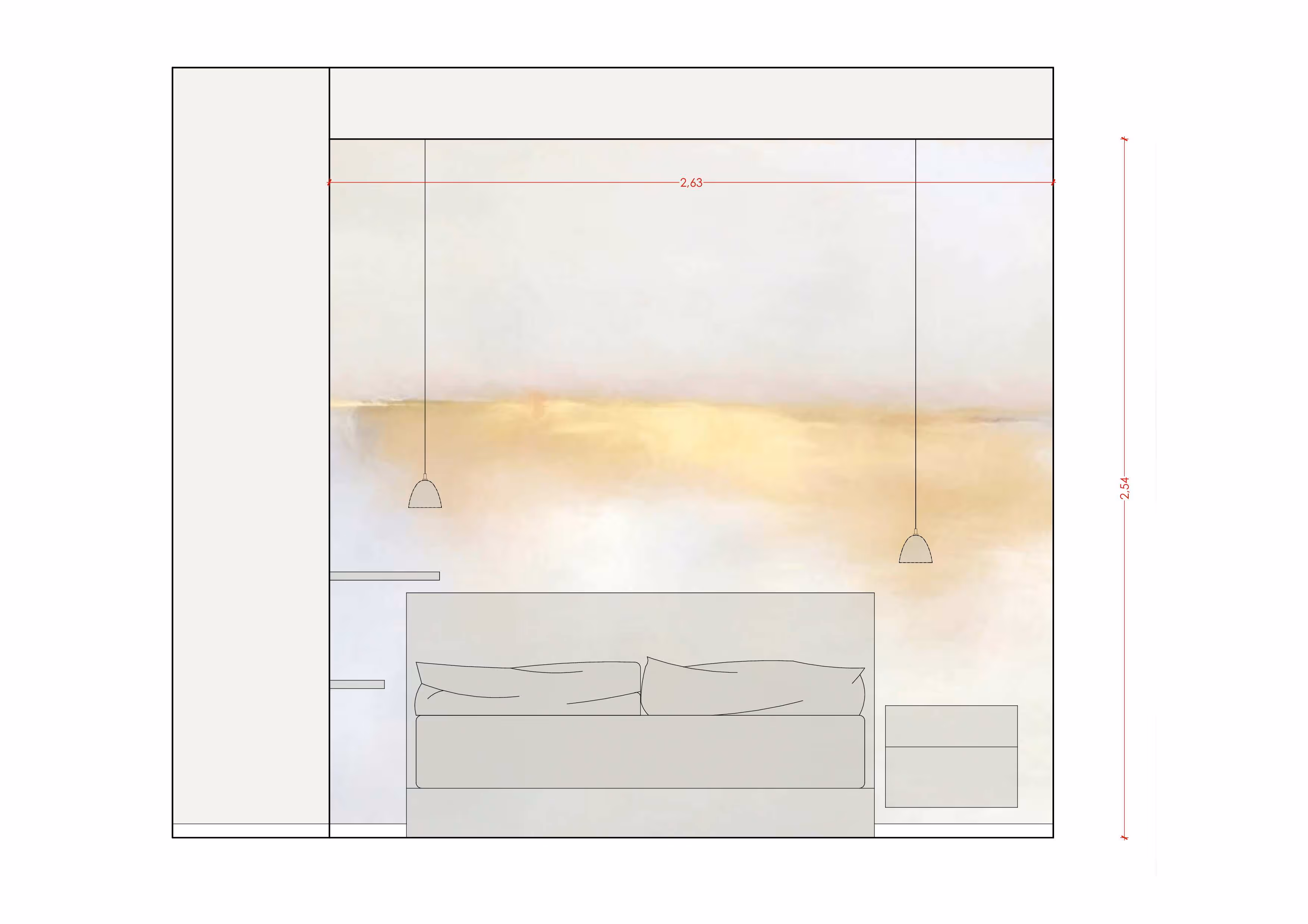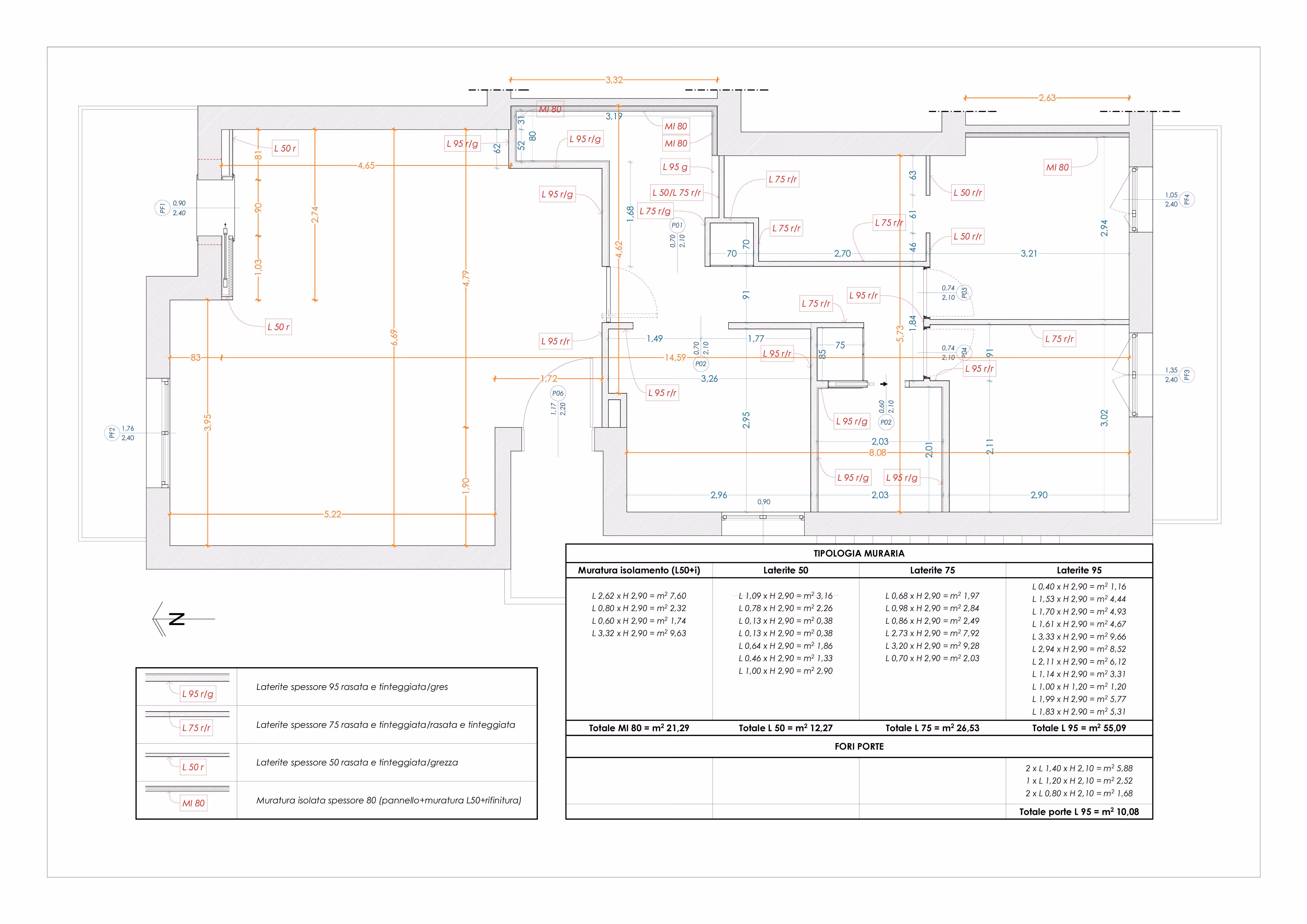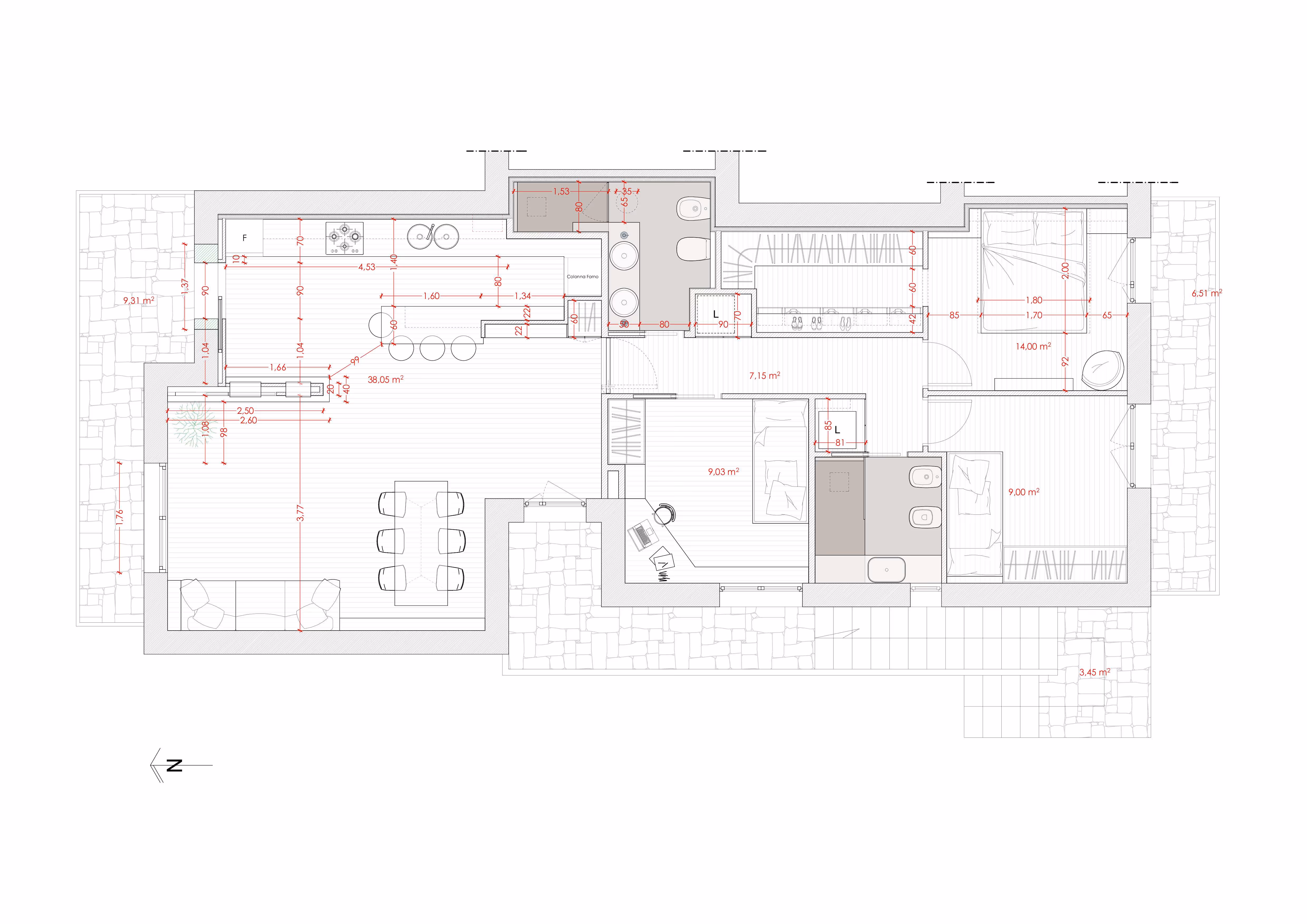 L’appartamento, con superficie di circa 90 m² e sviluppo longitudinale nord-sud, è stato completamente riconfigurato attraverso demolizioni interne e nuova compartimentazione muraria, al fine di realizzare: