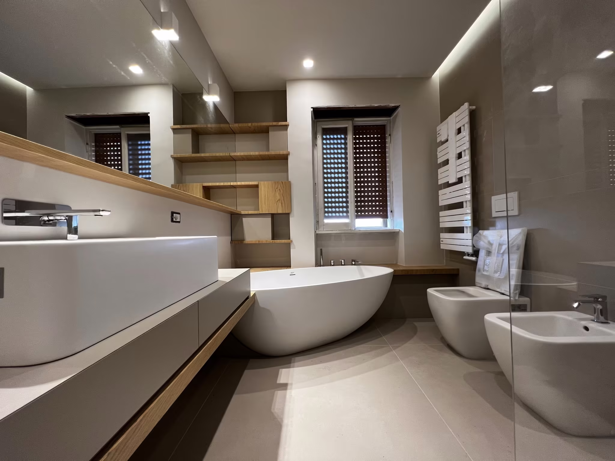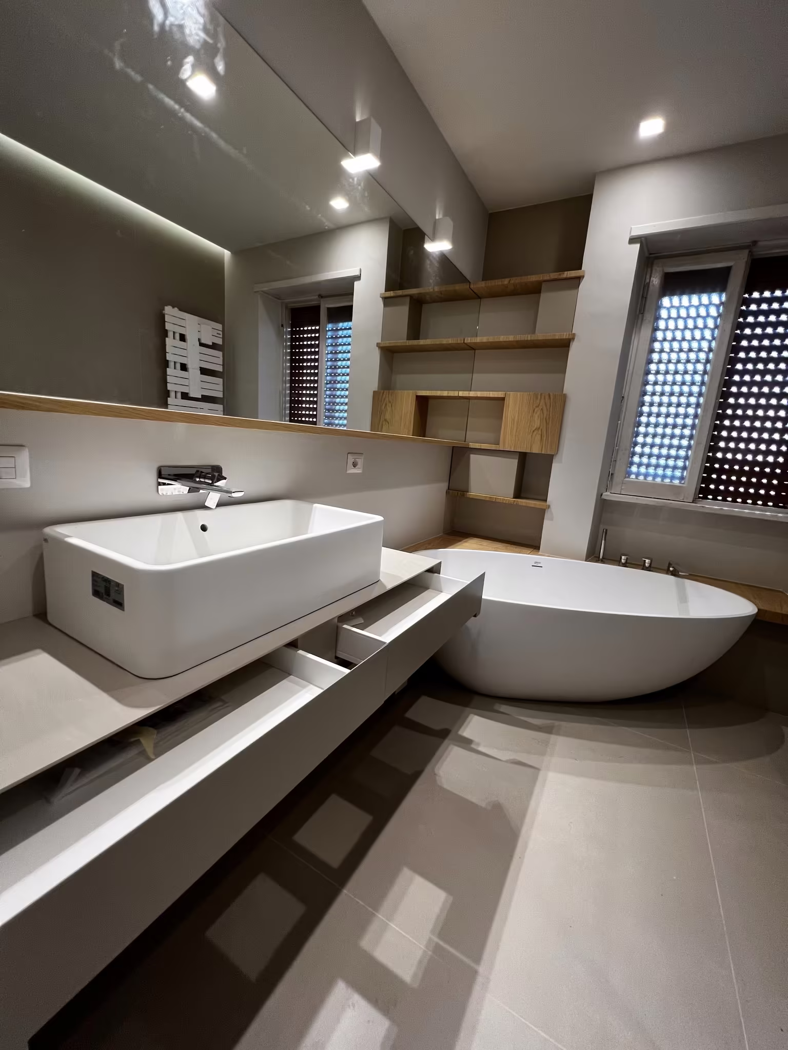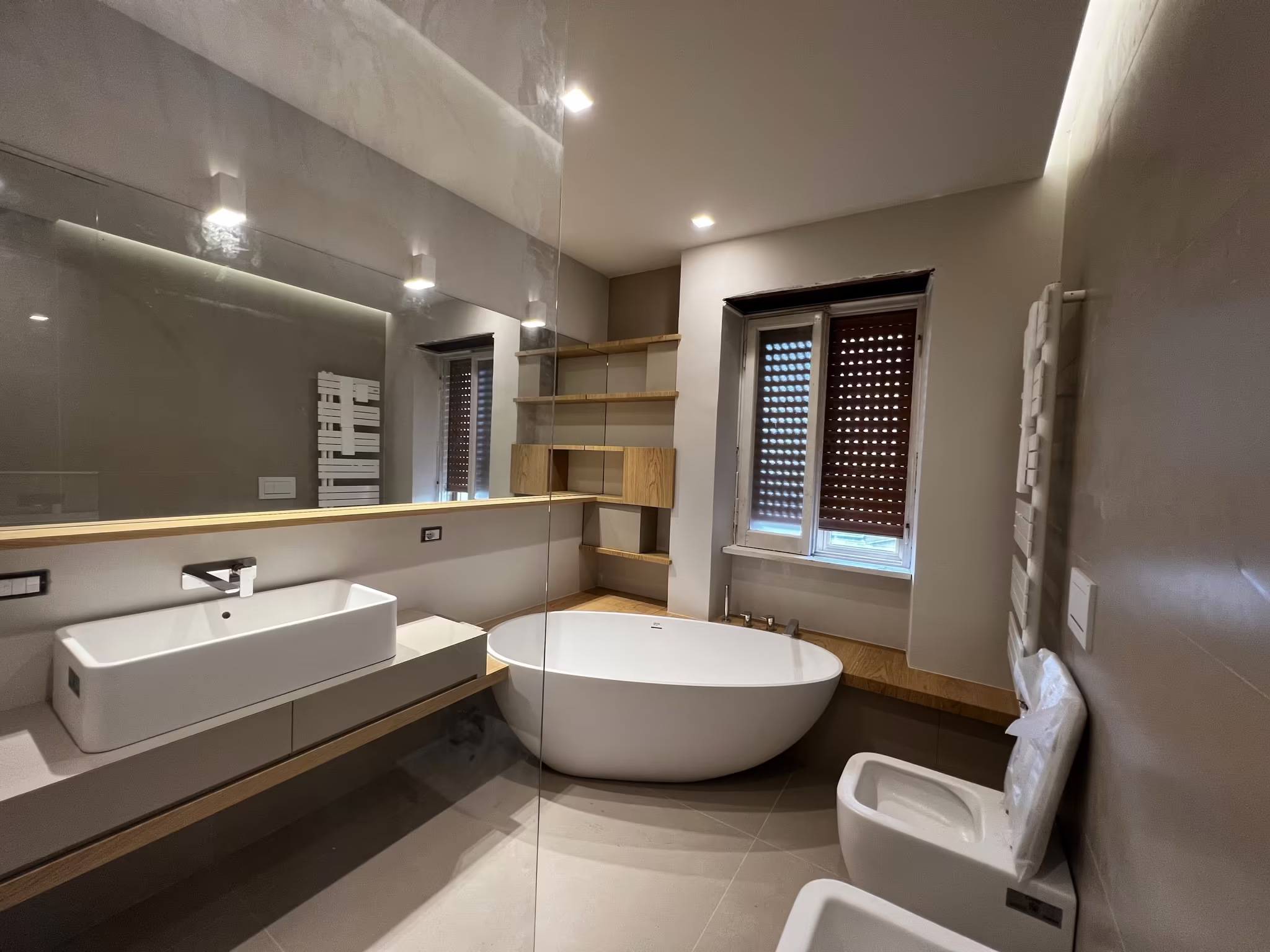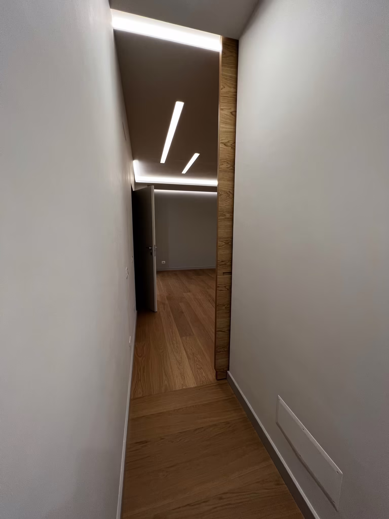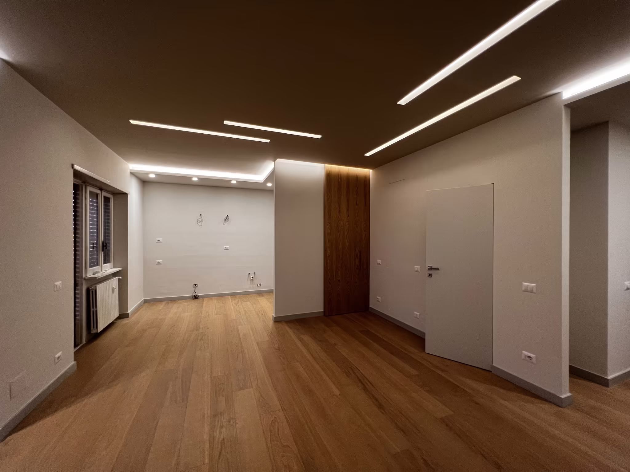 La ristrutturazione ha completamente trasformato l’immobile, restituendo spazi moderni e funzionali, un’illuminazione integrata nei controsoffitti e finiture contemporanee di alto livello. La soddisfazione del cliente è stata costante in ogni fase del cantiere, e continua ancora oggi con parole di apprezzamento per la qualità dell’intervento eseguito e del progetto complessivo.