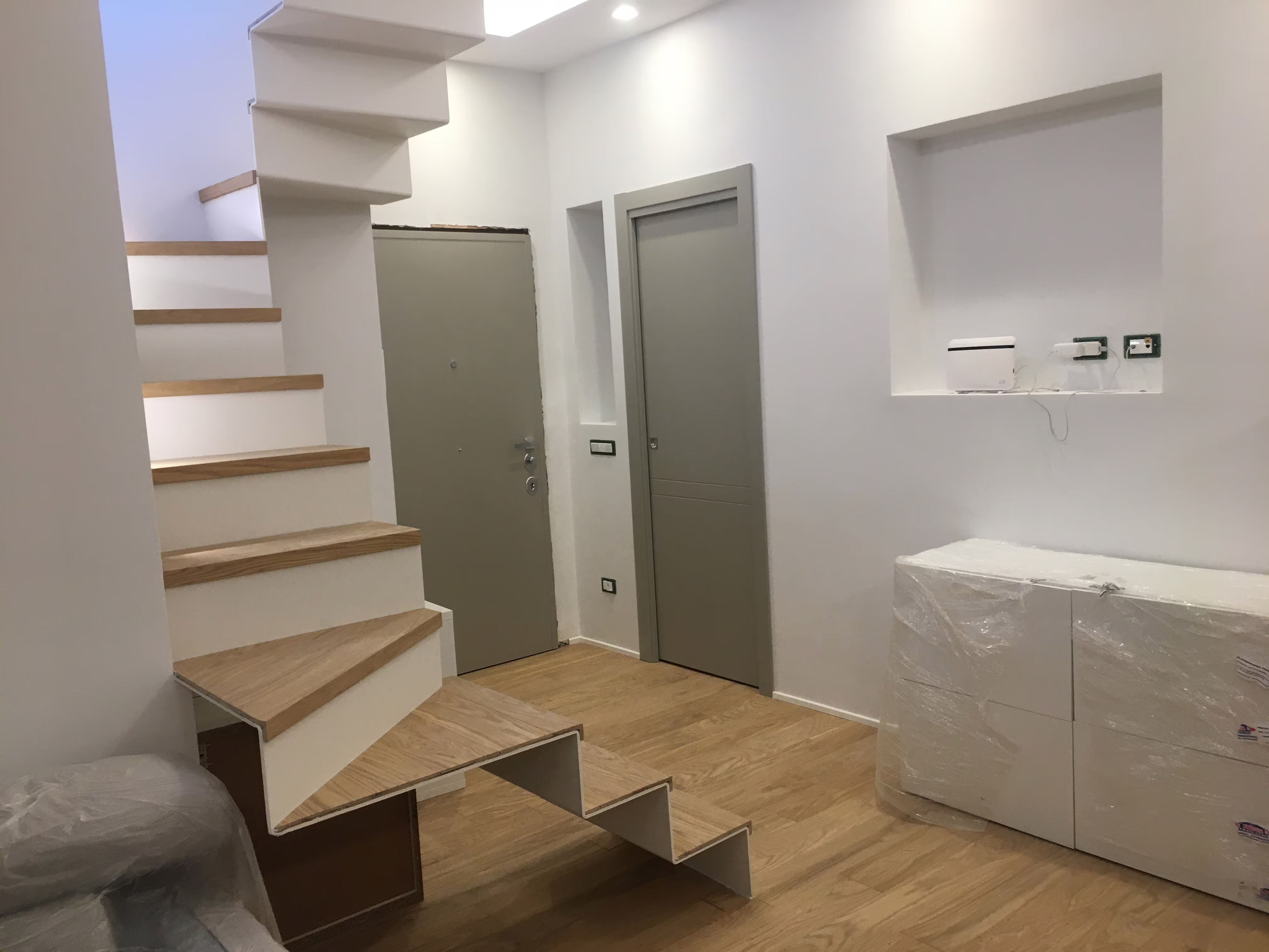 Intervento di ristrutturazione completa di un appartamento su due livelli, situato al sesto piano di uno stabile nel quartiere Talenti a Roma.