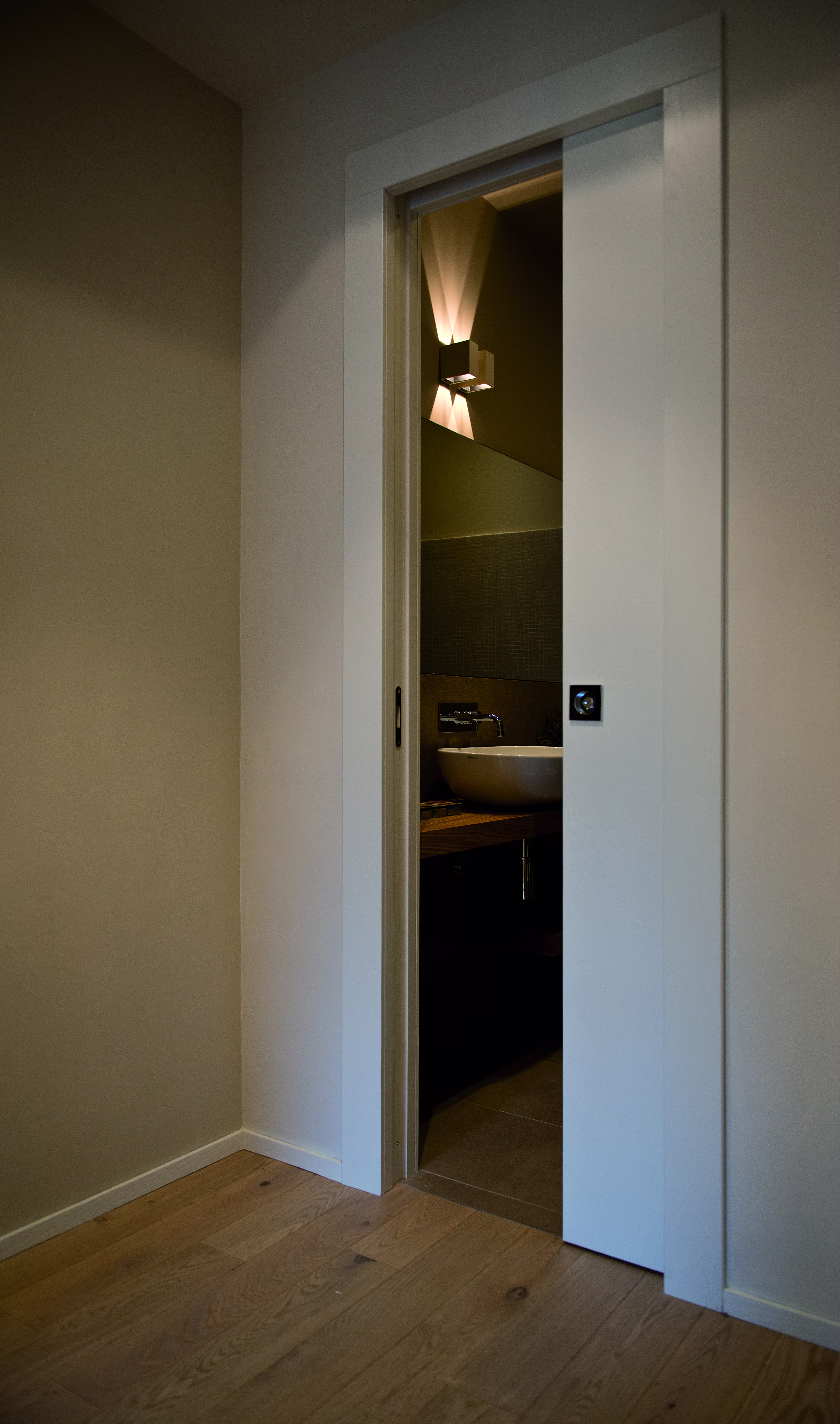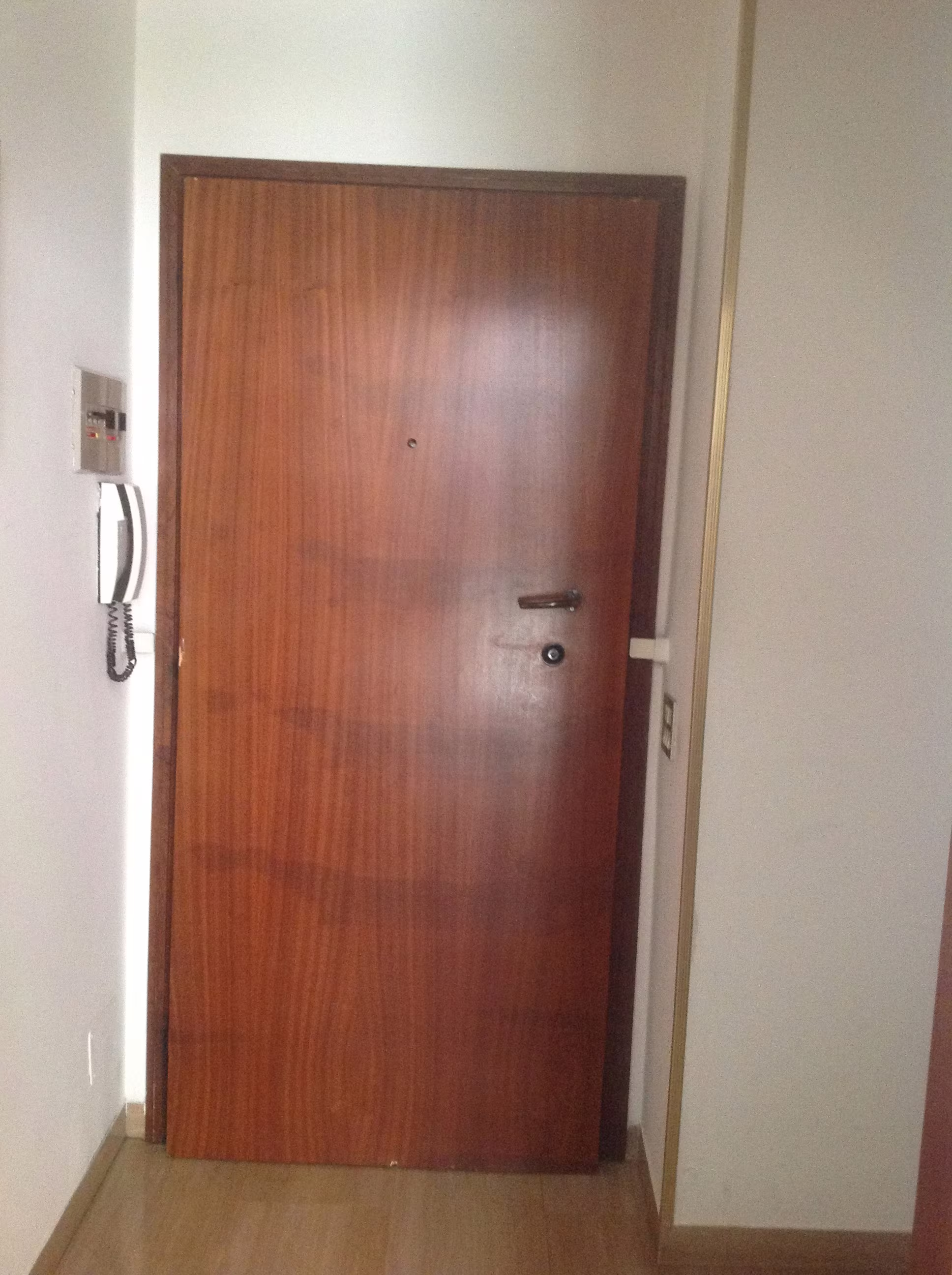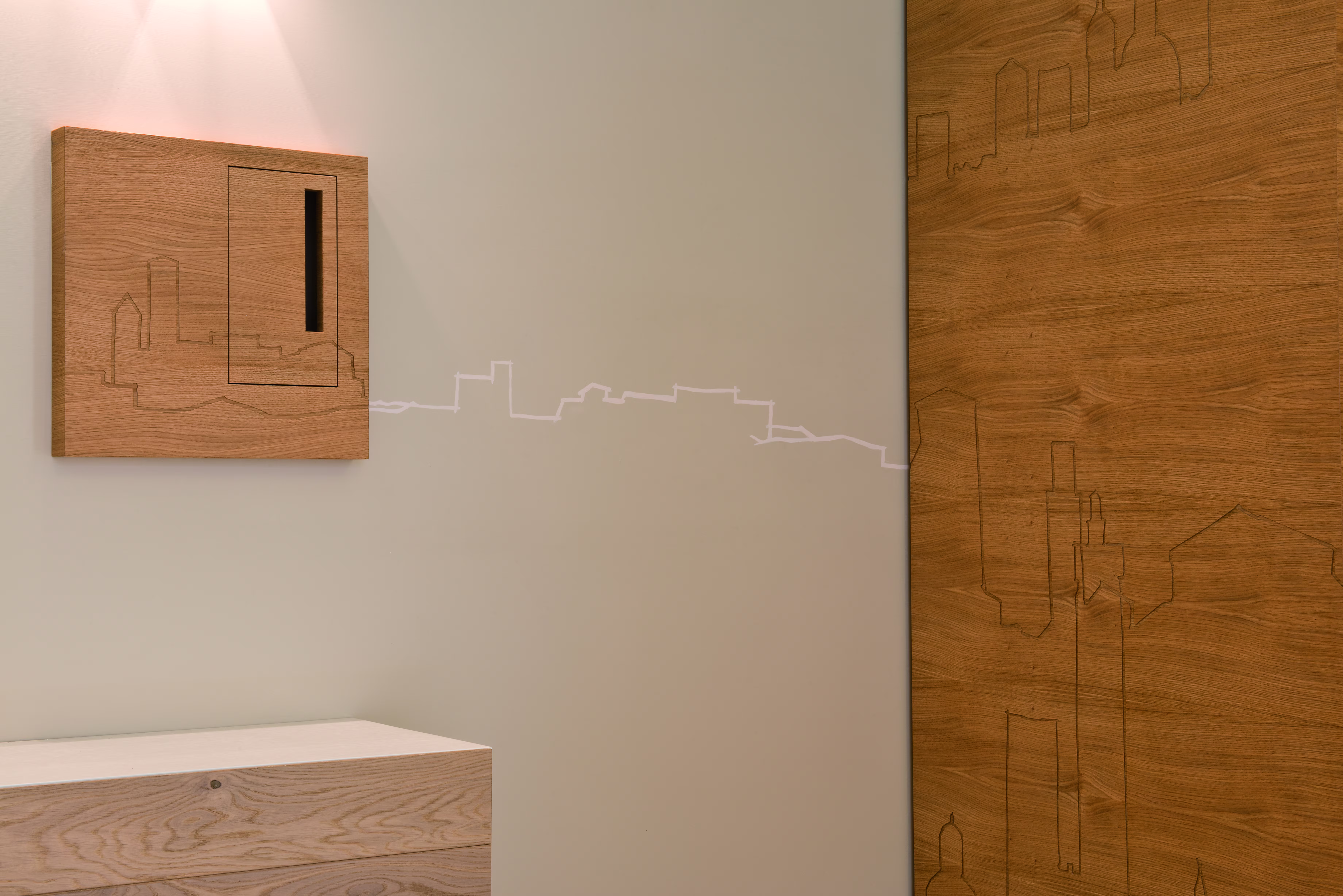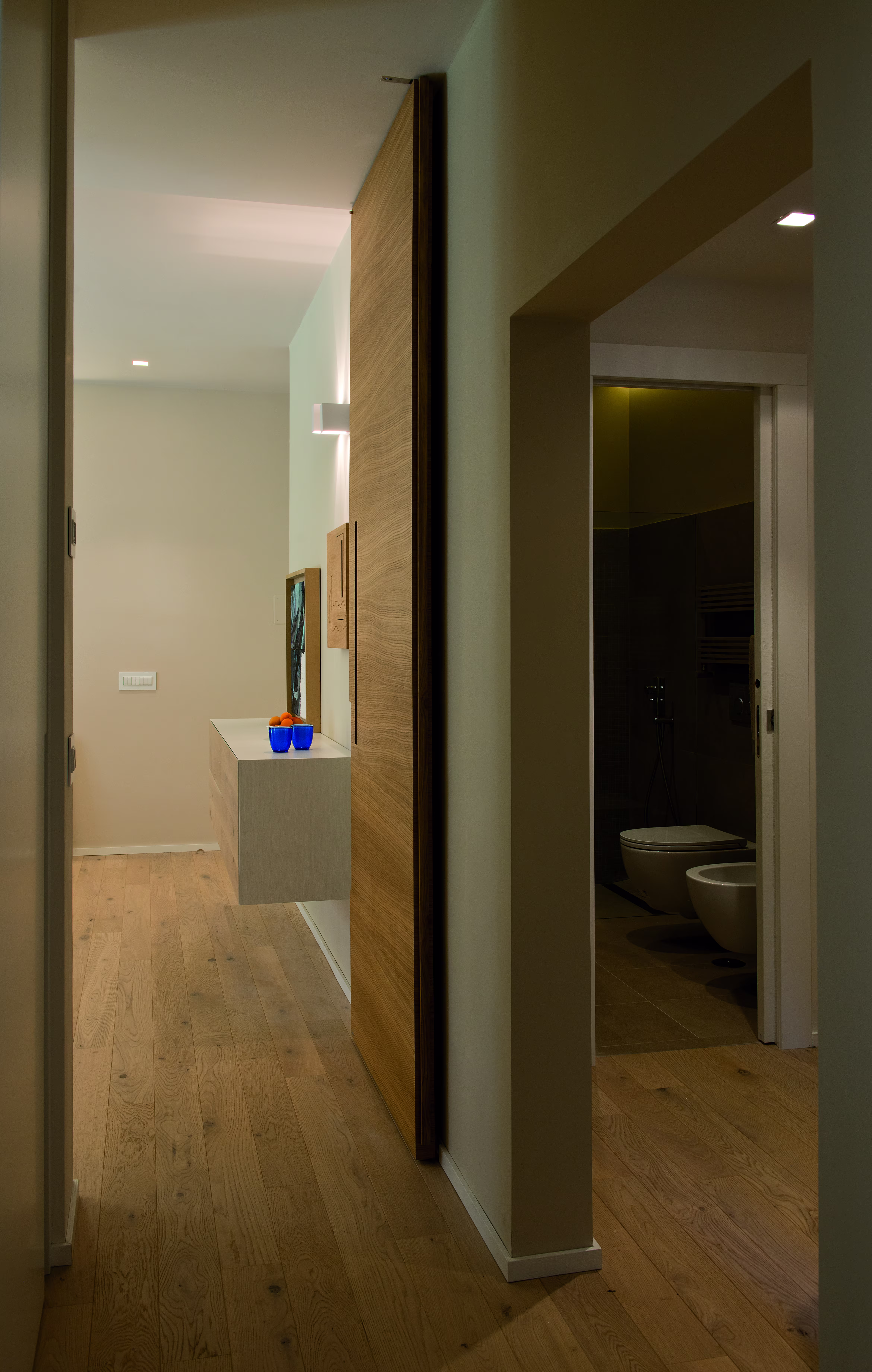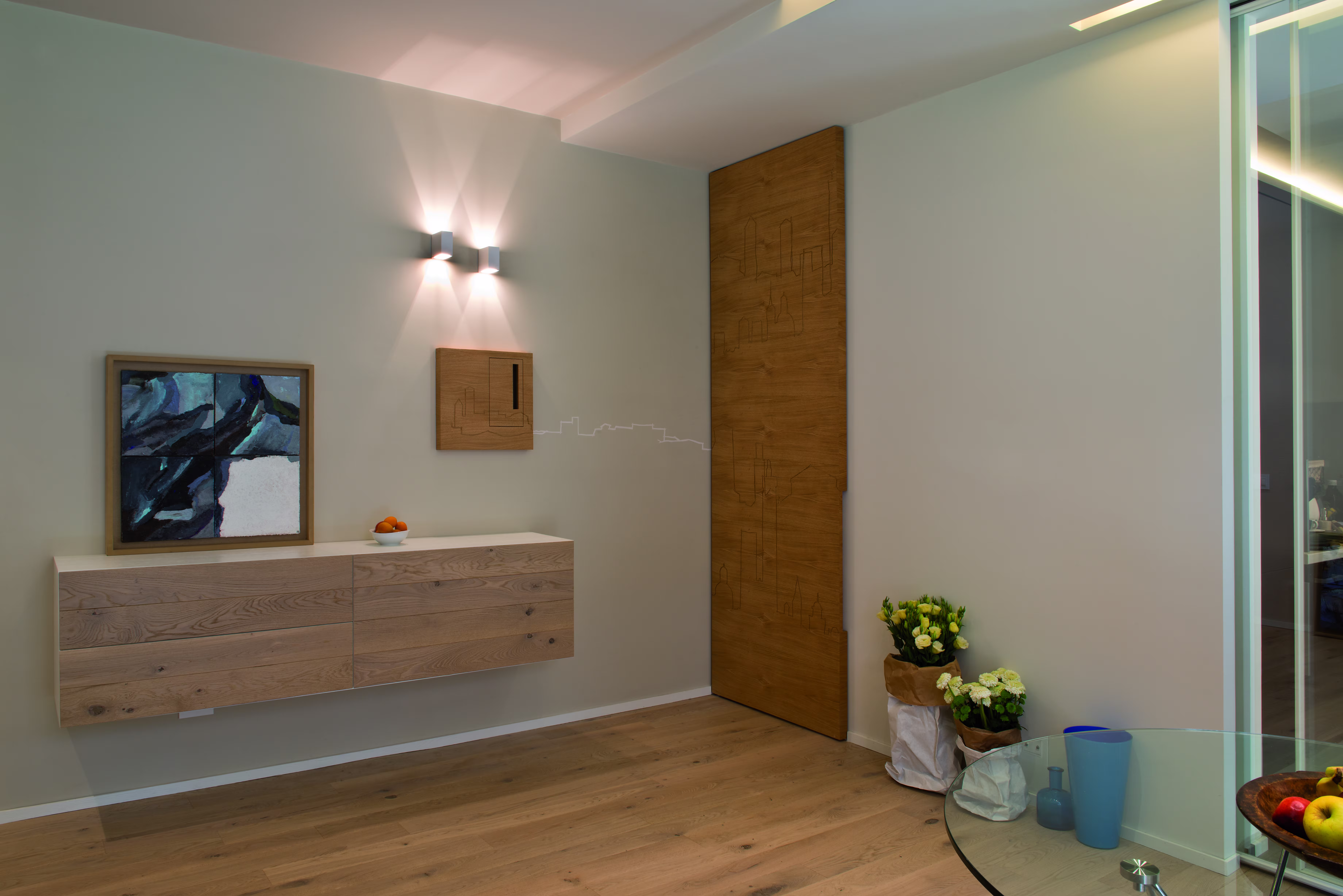 Le lavorazioni hanno incluso anche la posa di pavimenti in rovere naturale, il rivestimento e l’allineamento delle superfici lignee della madia su misura e del quadro scultoreo in rovere che cela il citofono, attraversato dal segno grafico dello skyline della “città delle torri”.