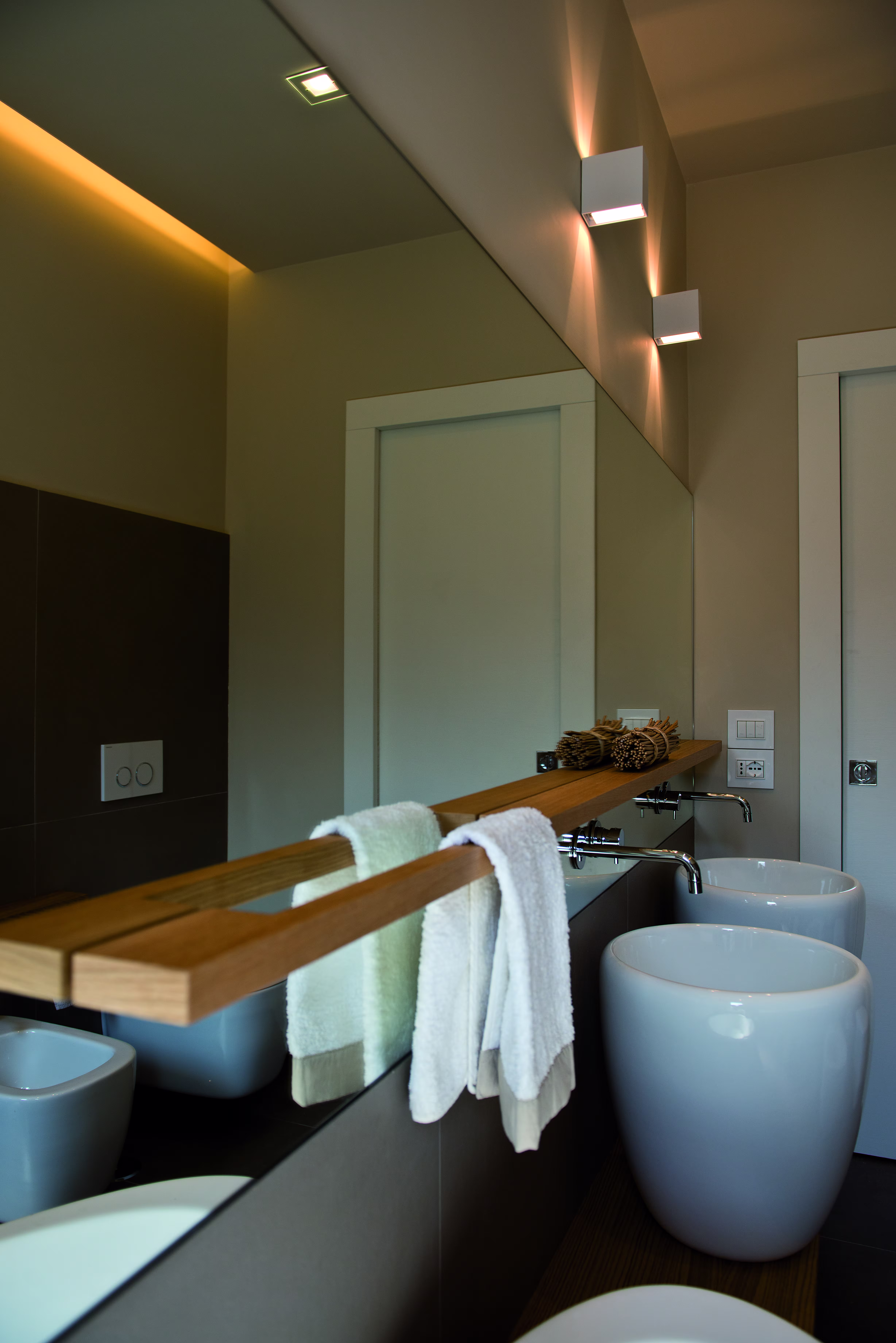 - Il bagno patronale, vincolato da strette pareti portanti, è stato completamente ripensato per accogliere una vasca in pietra naturale posizionata in modo disassato, avvolta da una panca in legno che integra i lavabi a catino. Una soluzione che ha richiesto precisione millimetrica nella posa e un coordinamento puntuale tra impiantistica e falegnameria.